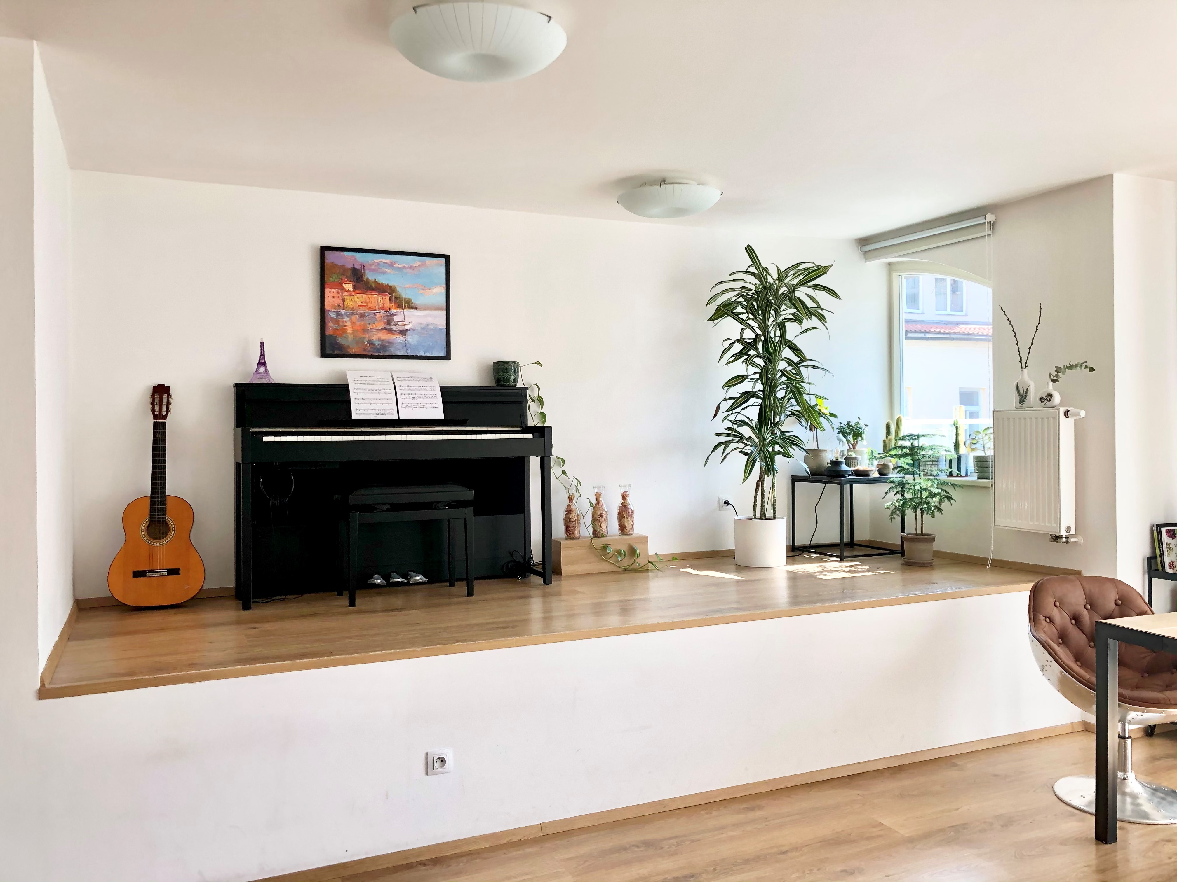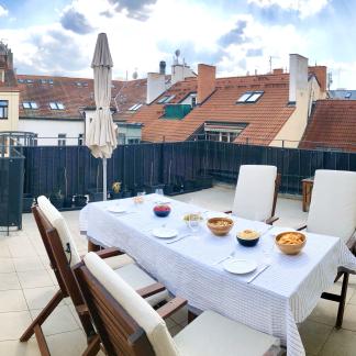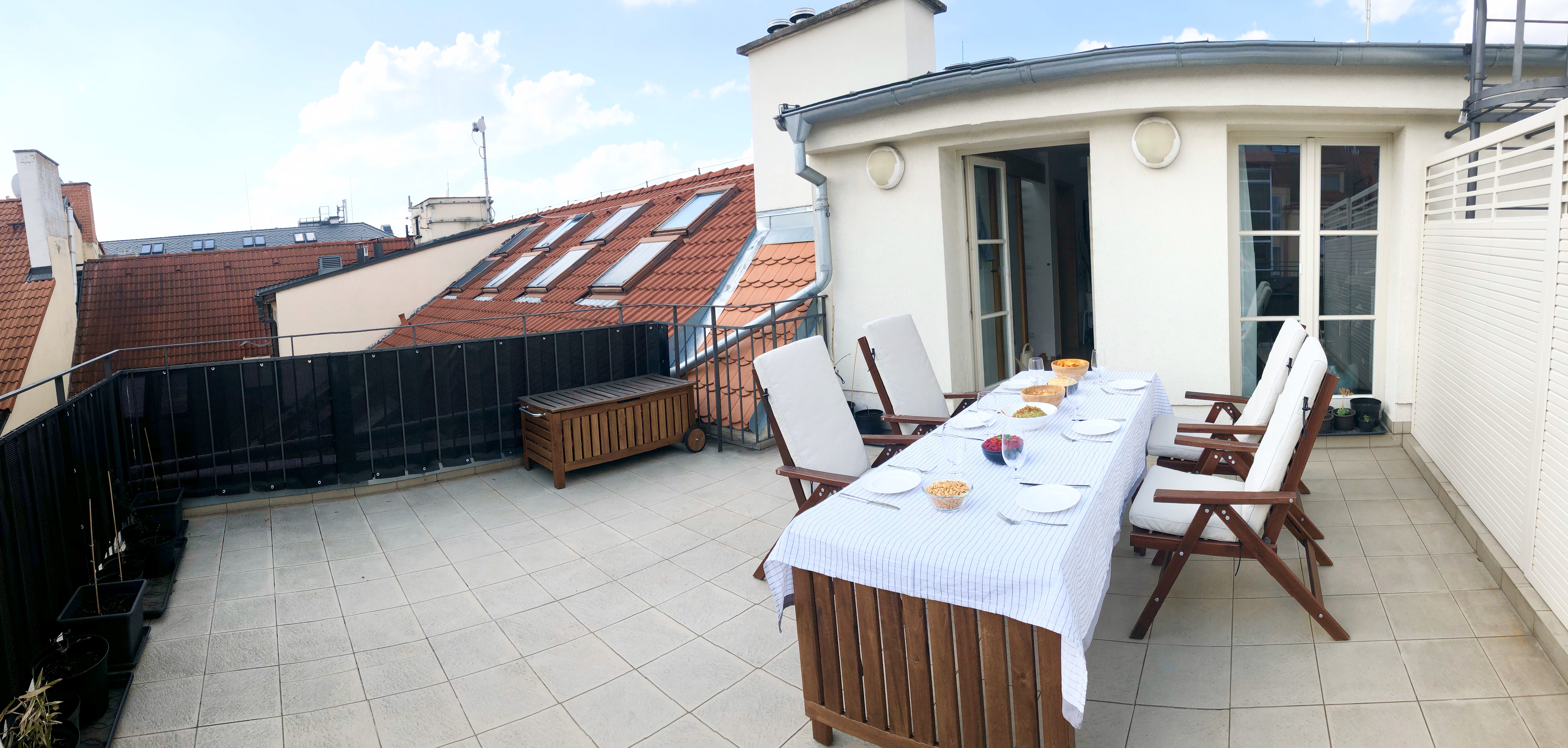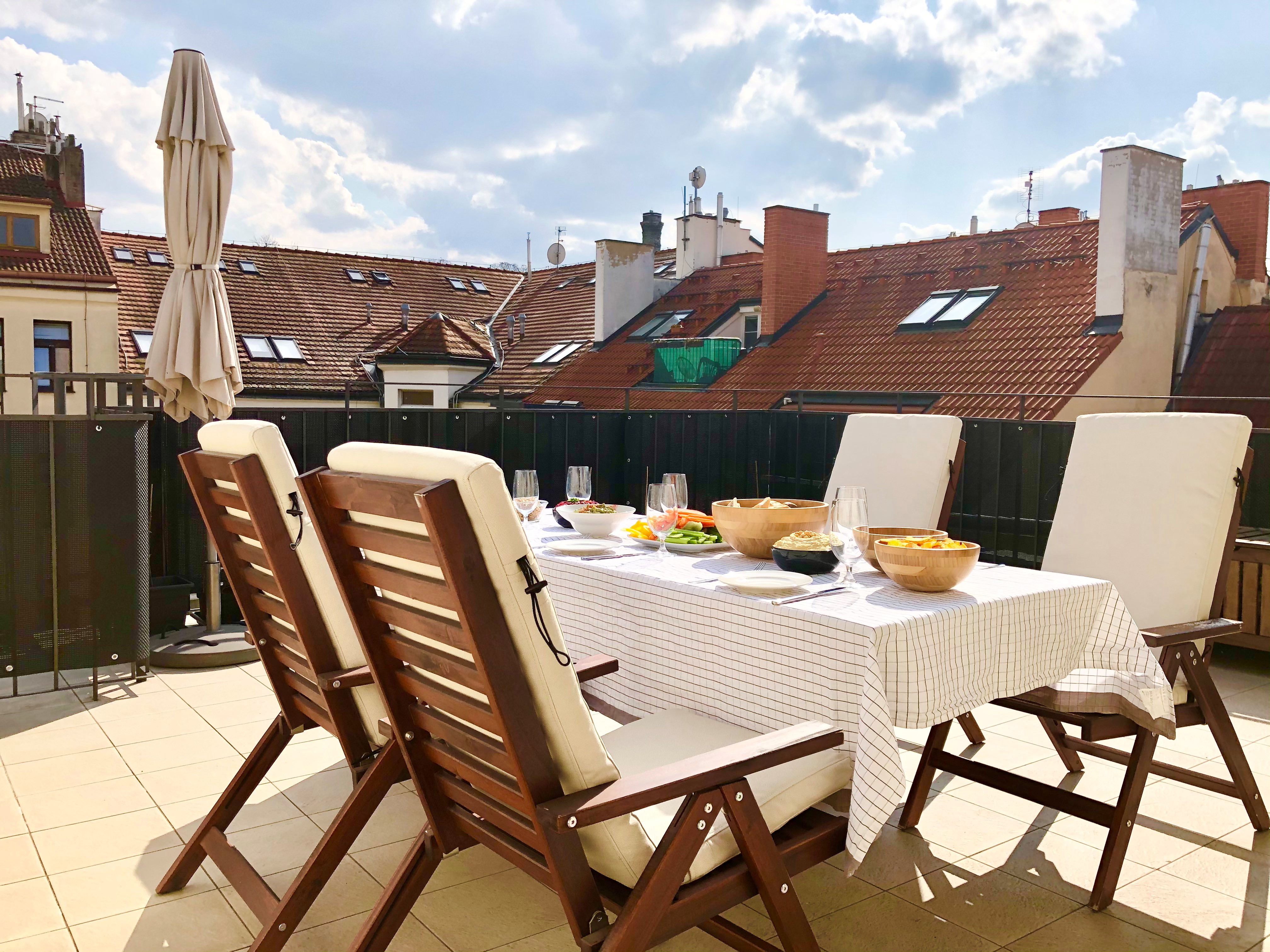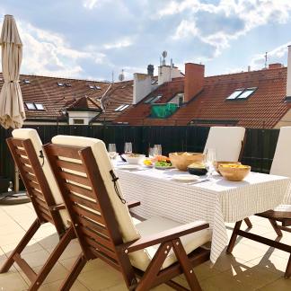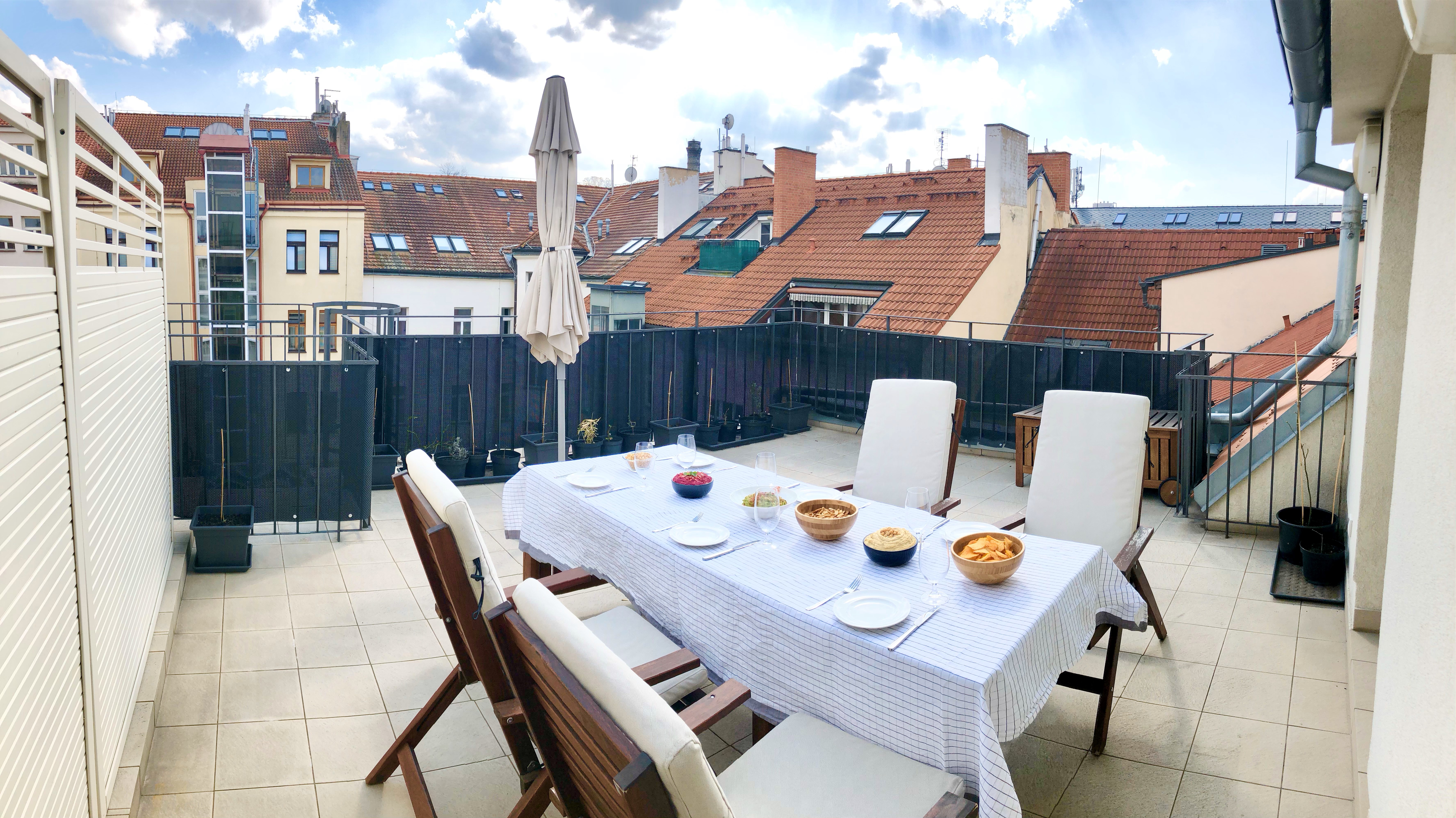 - Horní patro: velký otevřený prostor vhodný jako salonek či třetí ložnice, koupelna s sprchovým koutem i WC, vstup na slunnou terasu (28,5 m2) s s výhledem na střechy Prahy.