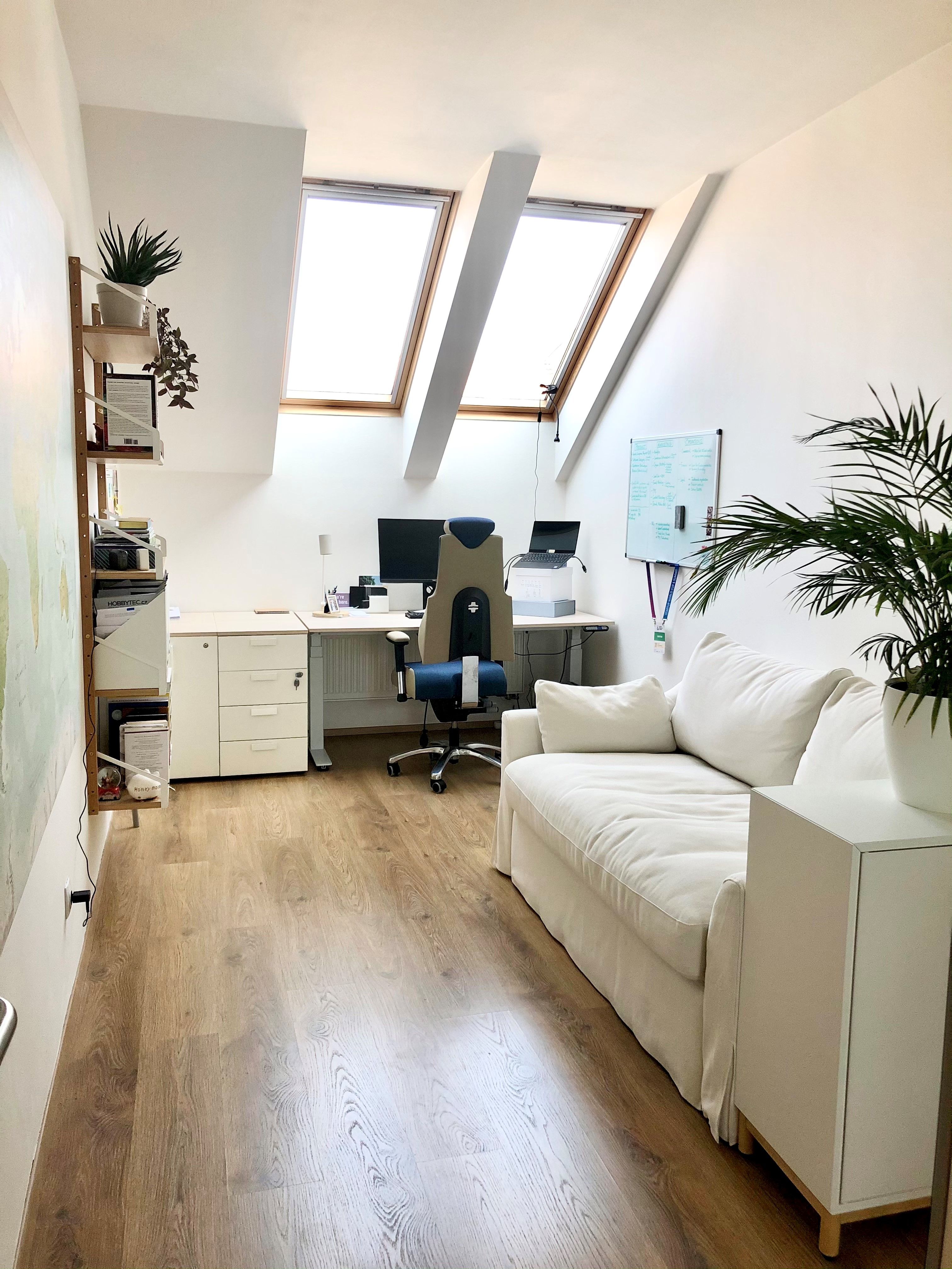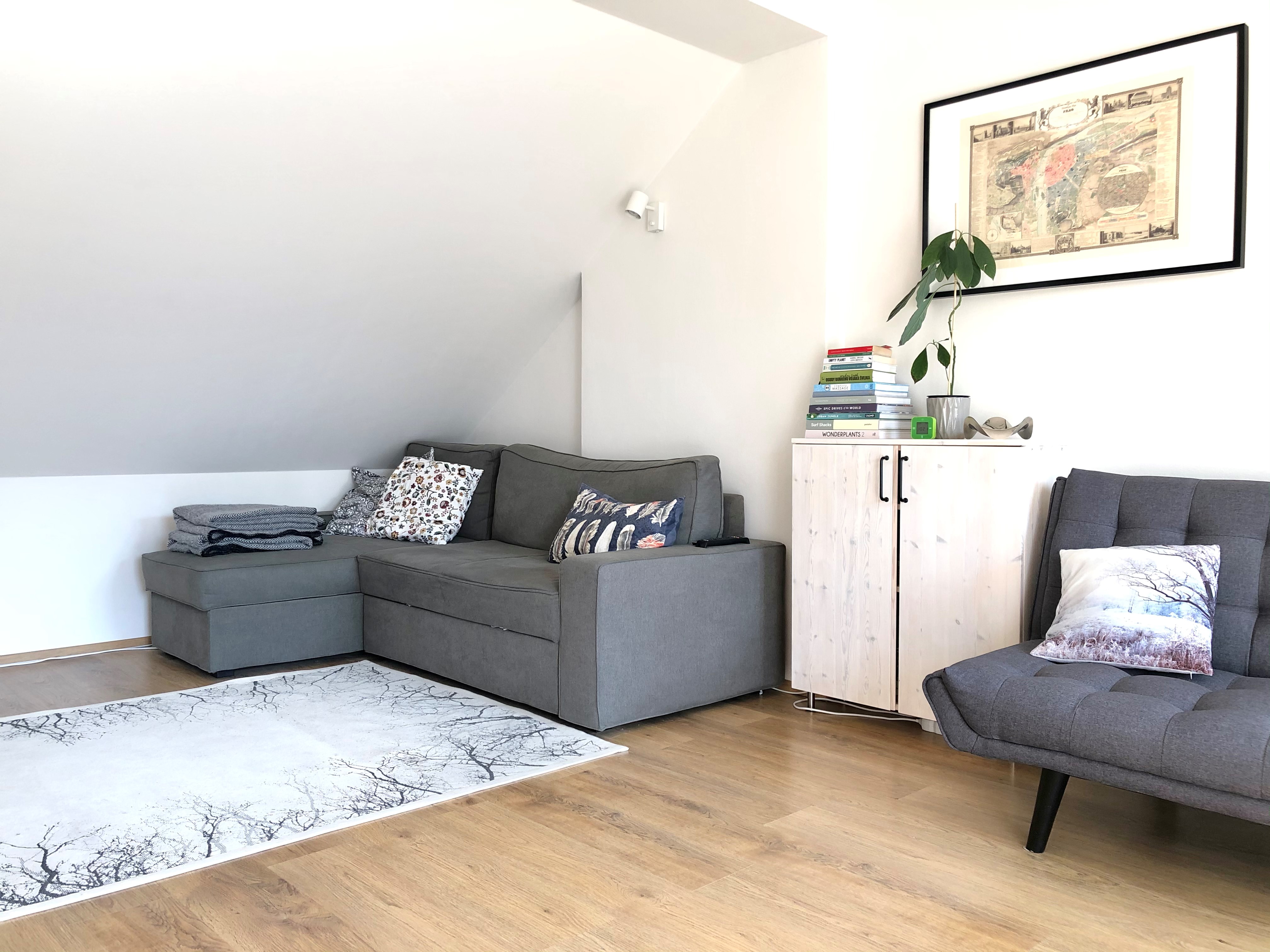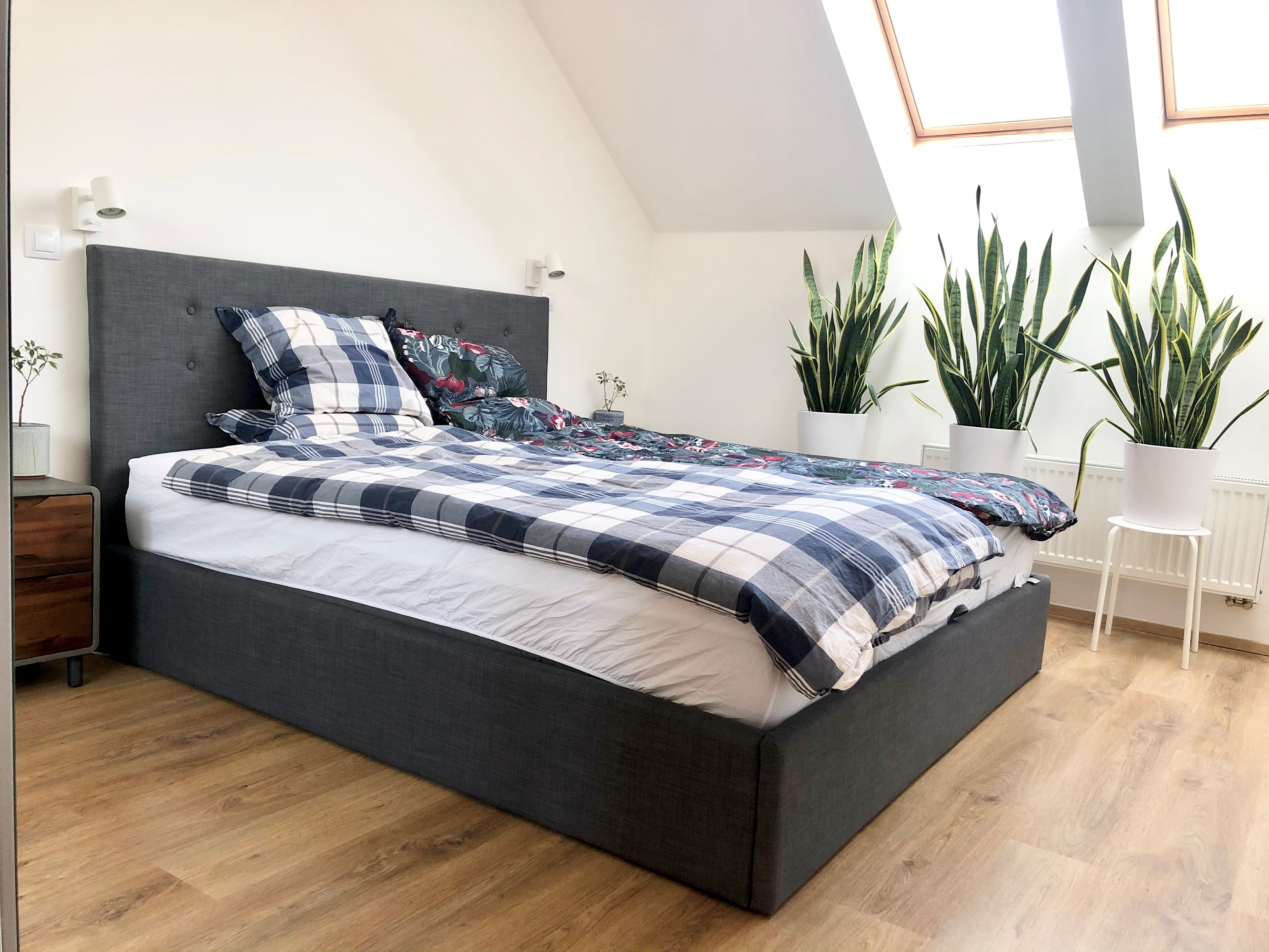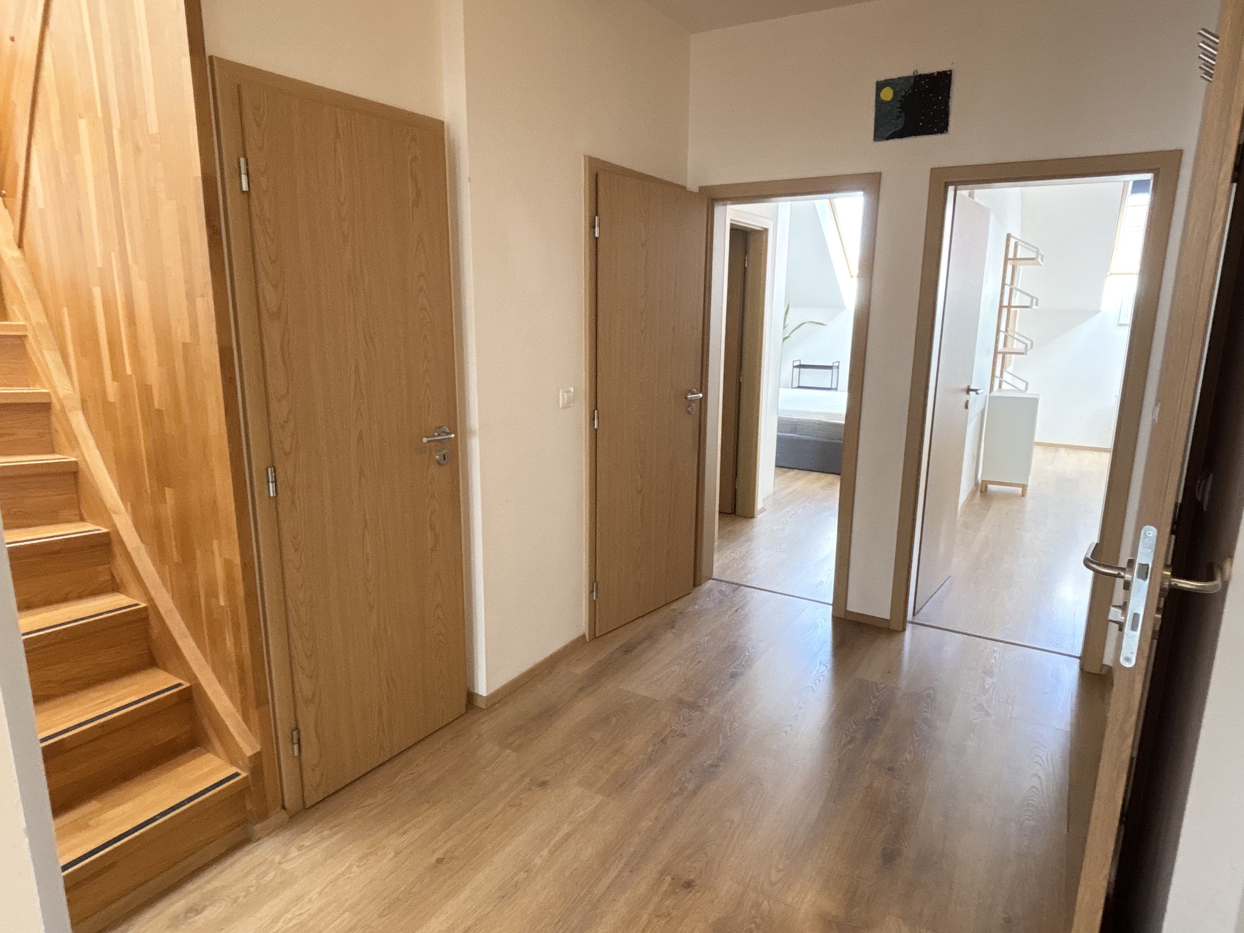 - Horní patro: velký otevřený prostor vhodný jako salonek či třetí ložnice, koupelna s sprchovým koutem i WC, vstup na slunnou terasu (28,5 m2) s s výhledem na střechy Prahy.