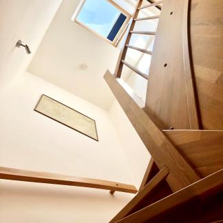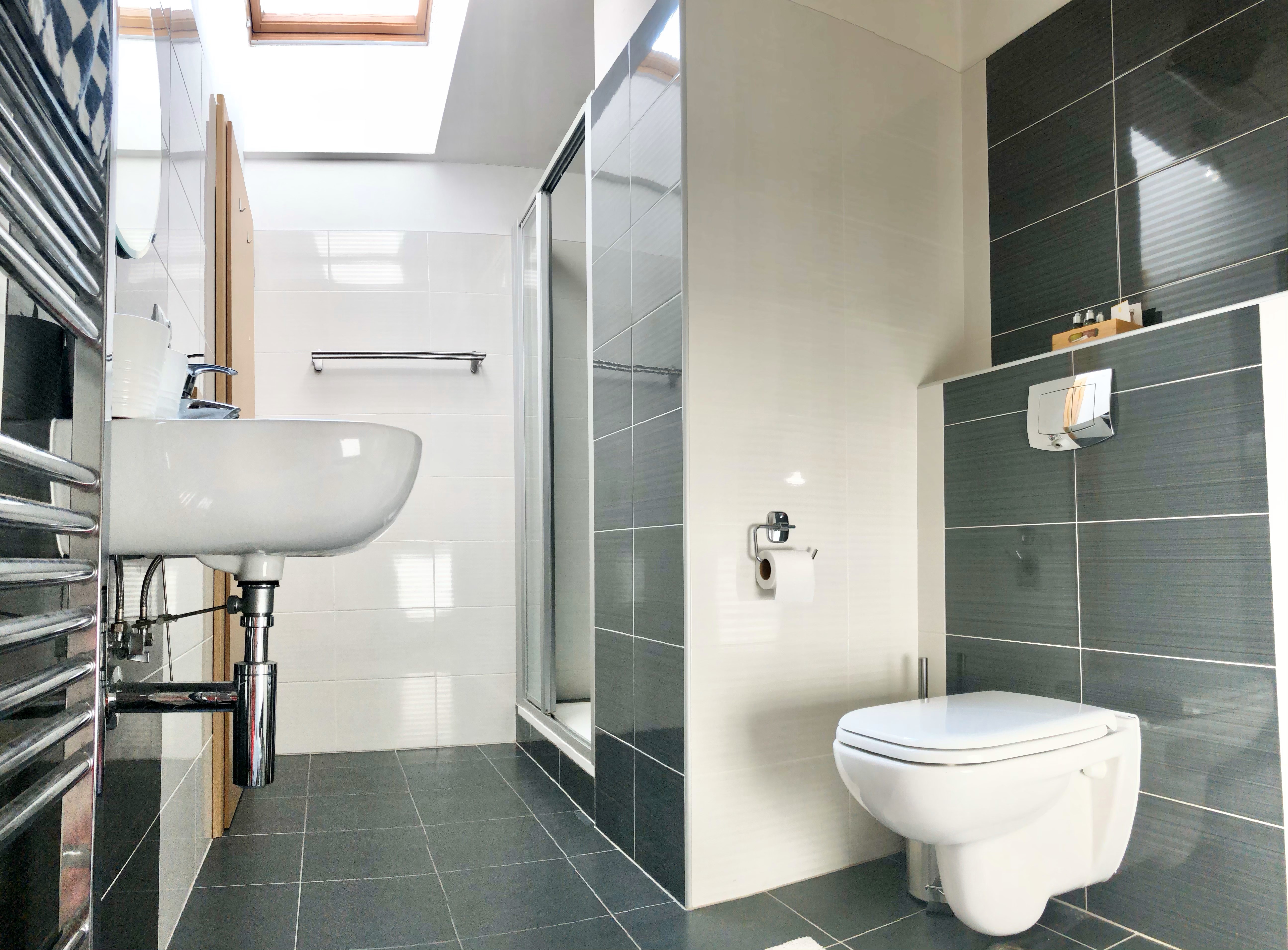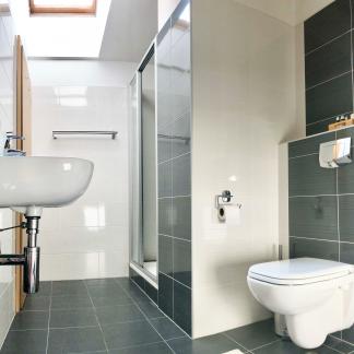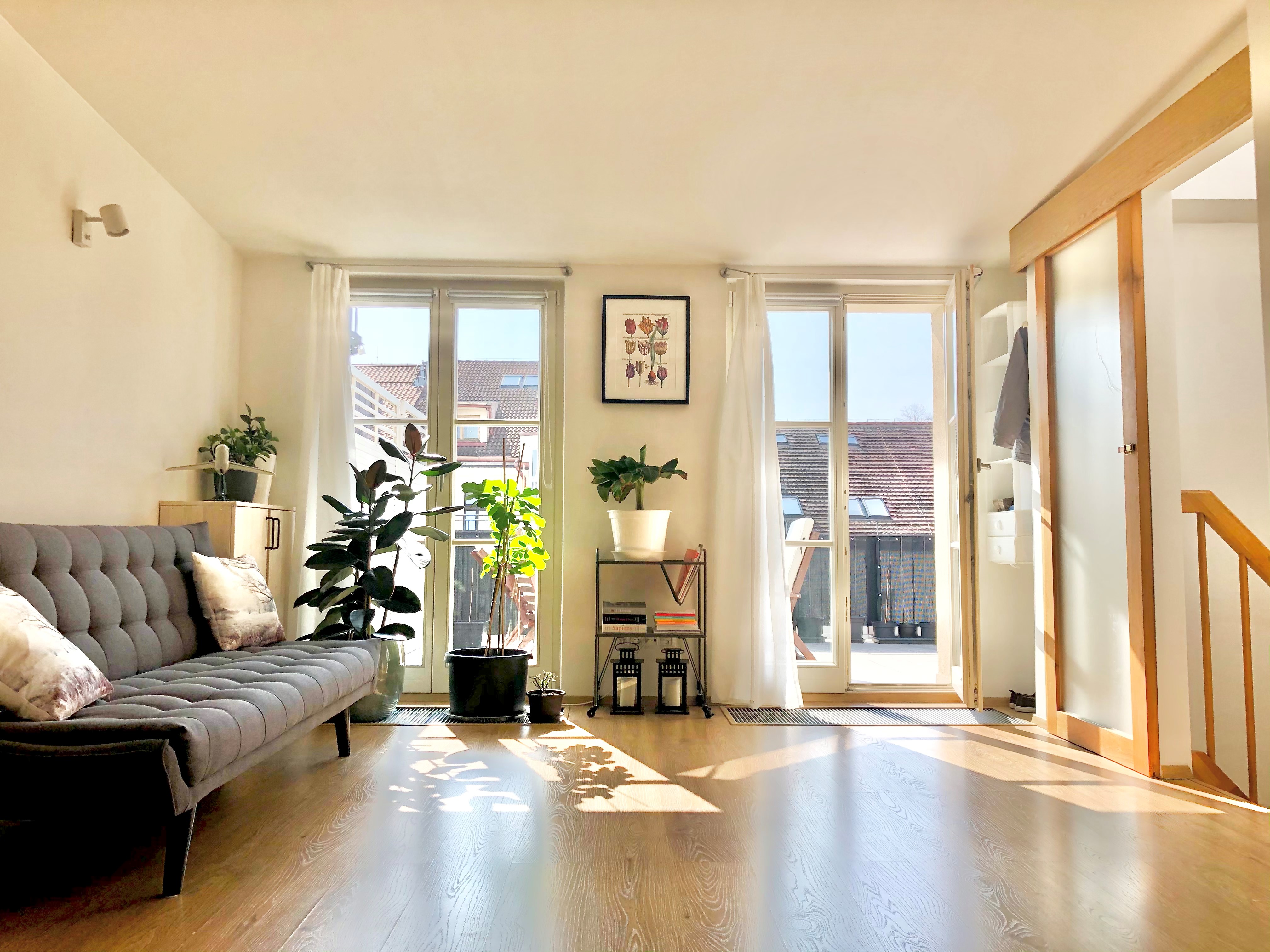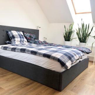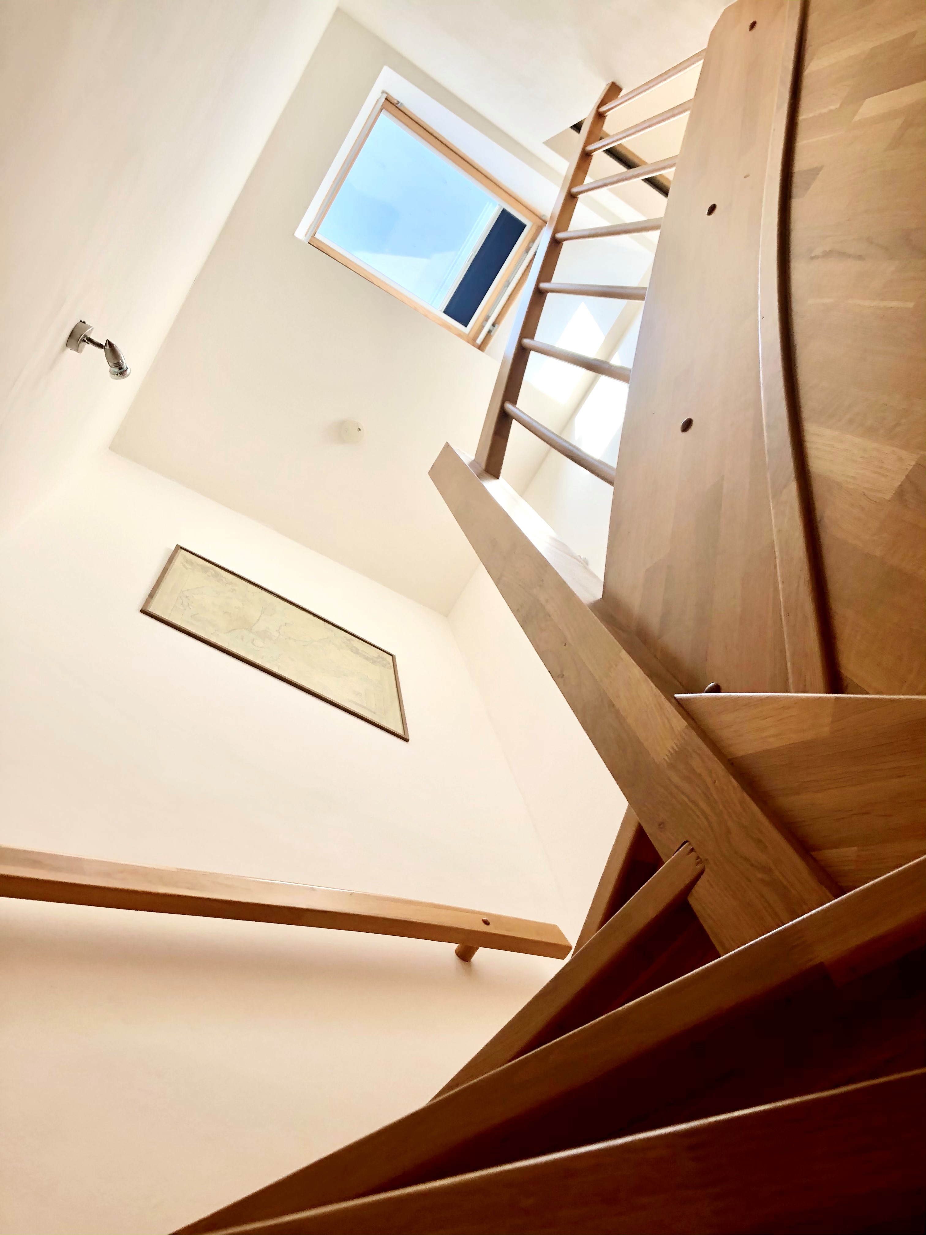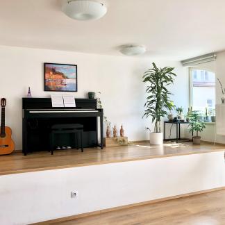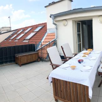 - Horní patro: velký otevřený prostor vhodný jako salonek či třetí ložnice, koupelna s sprchovým koutem i WC, vstup na slunnou terasu (28,5 m2) s s výhledem na střechy Prahy.