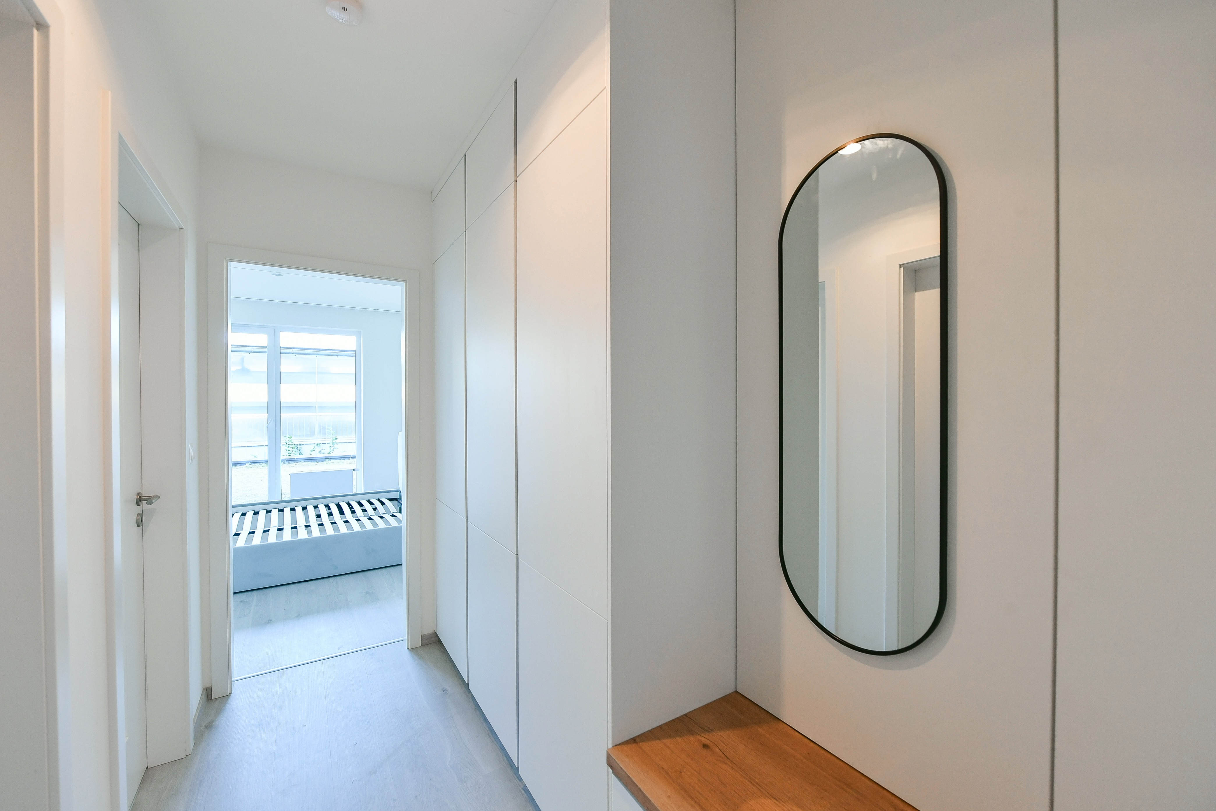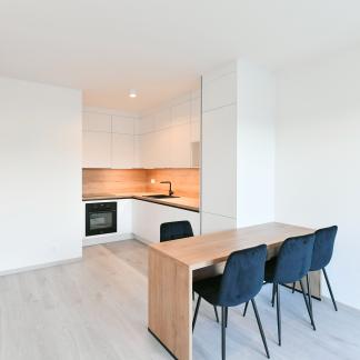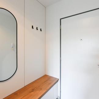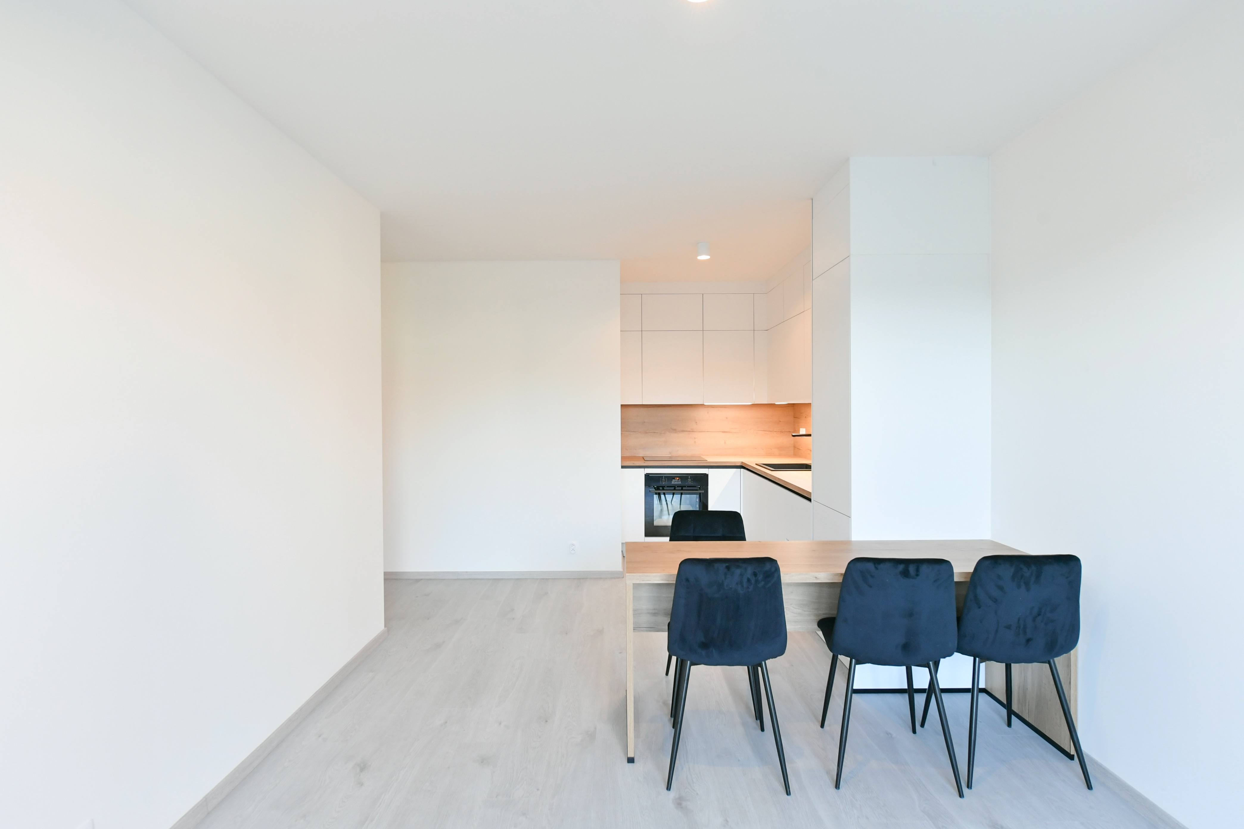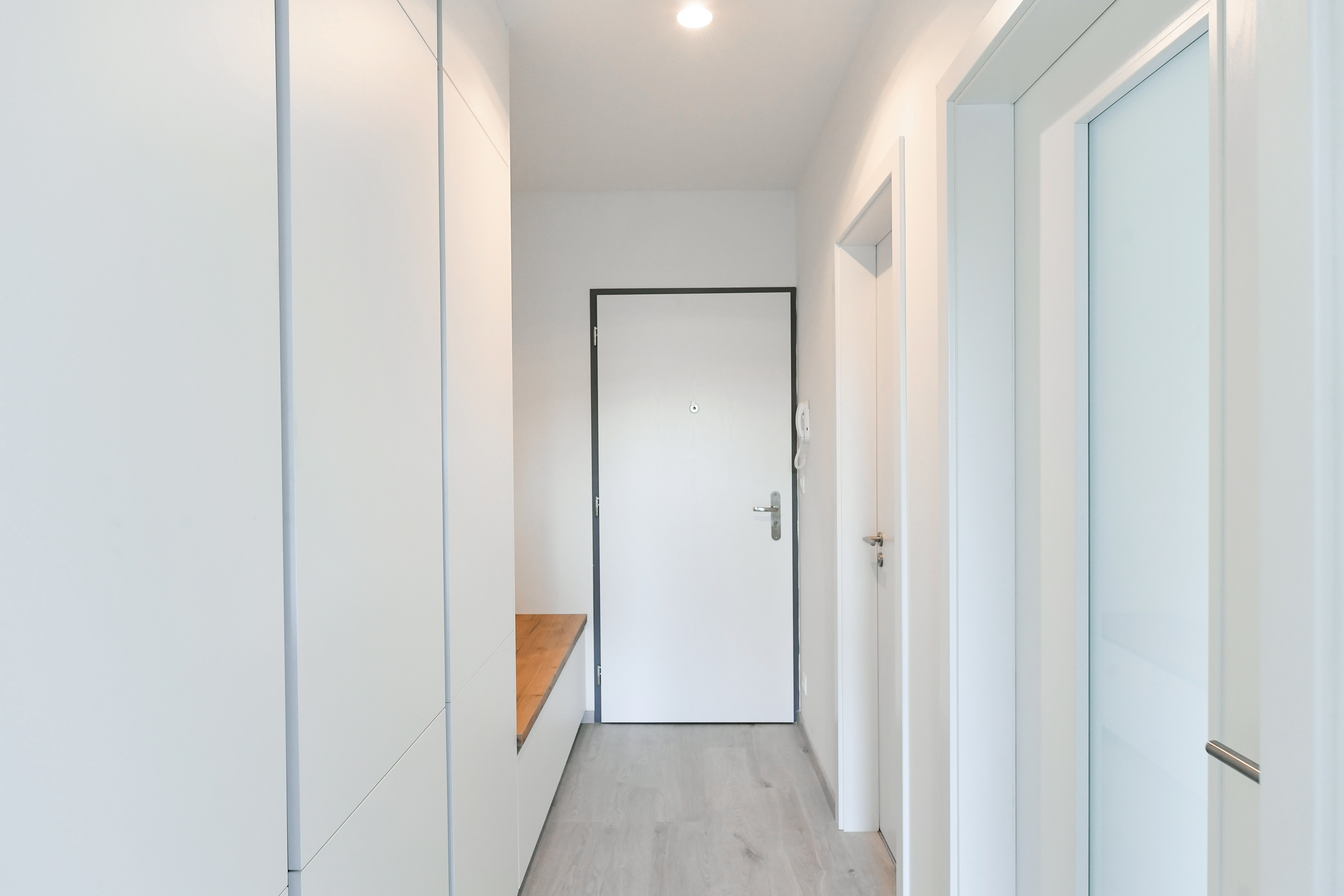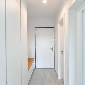 Byt je velmi tichý, světlý a elegantní, vybaven kuchyňskou linkou s jídelním stolem a šatními skříněmi na míru v prostorné vstupní hale. V ložnici je postel (bez matrace). V bytě se dále nachází koupelna se sprchovým koutem a pračkou.