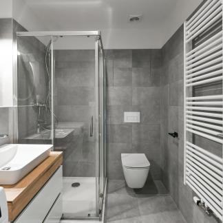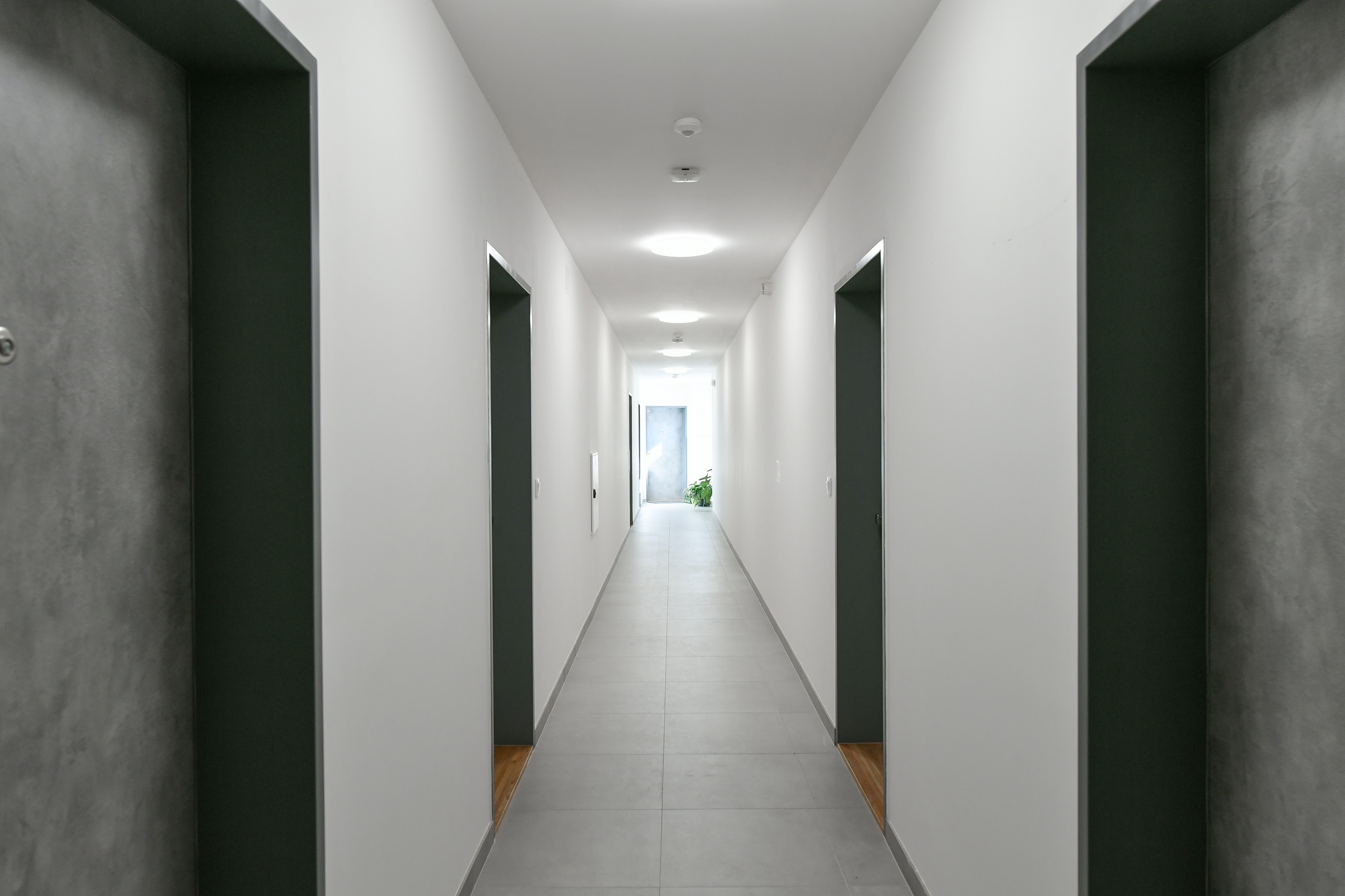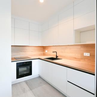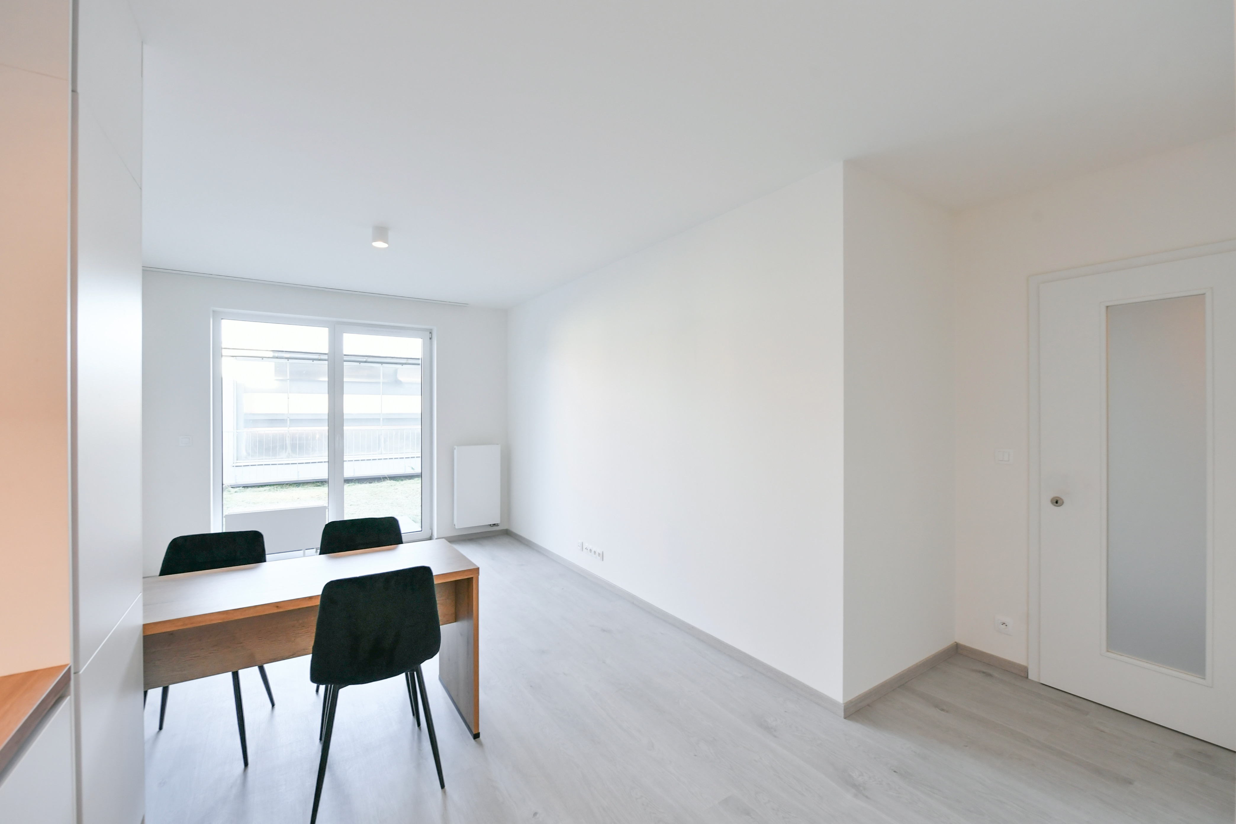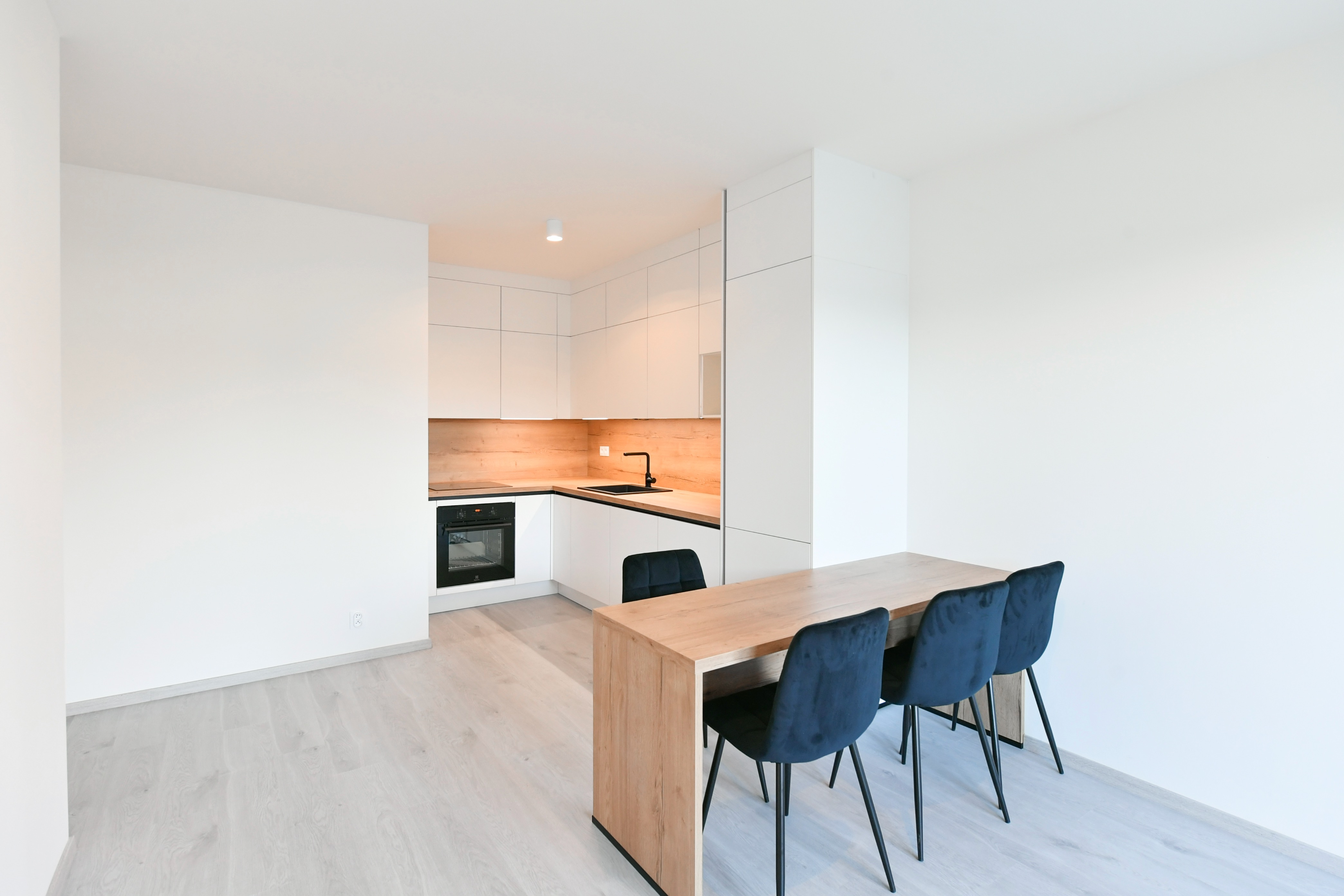 Byt je velmi tichý, světlý a elegantní, vybaven kuchyňskou linkou s jídelním stolem a šatními skříněmi na míru v prostorné vstupní hale. V ložnici je postel (bez matrace). V bytě se dále nachází koupelna se sprchovým koutem a pračkou.