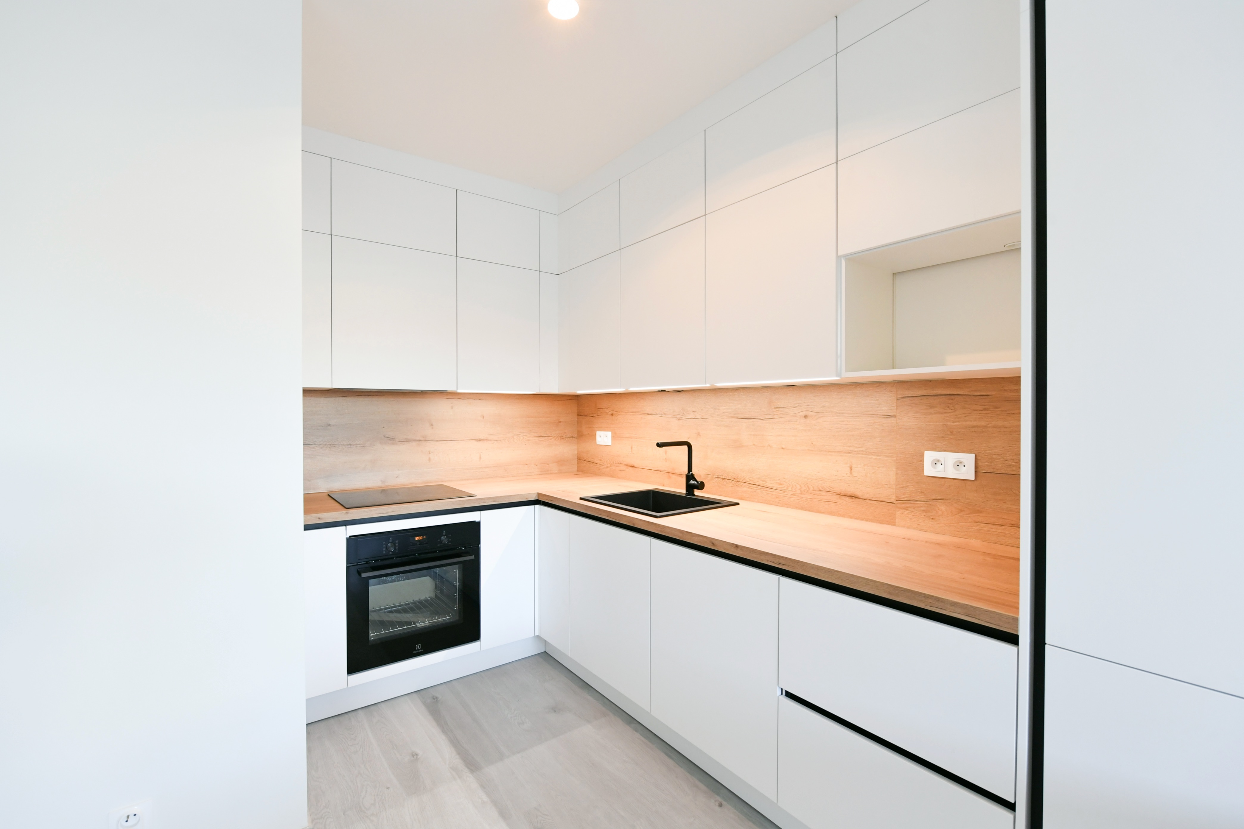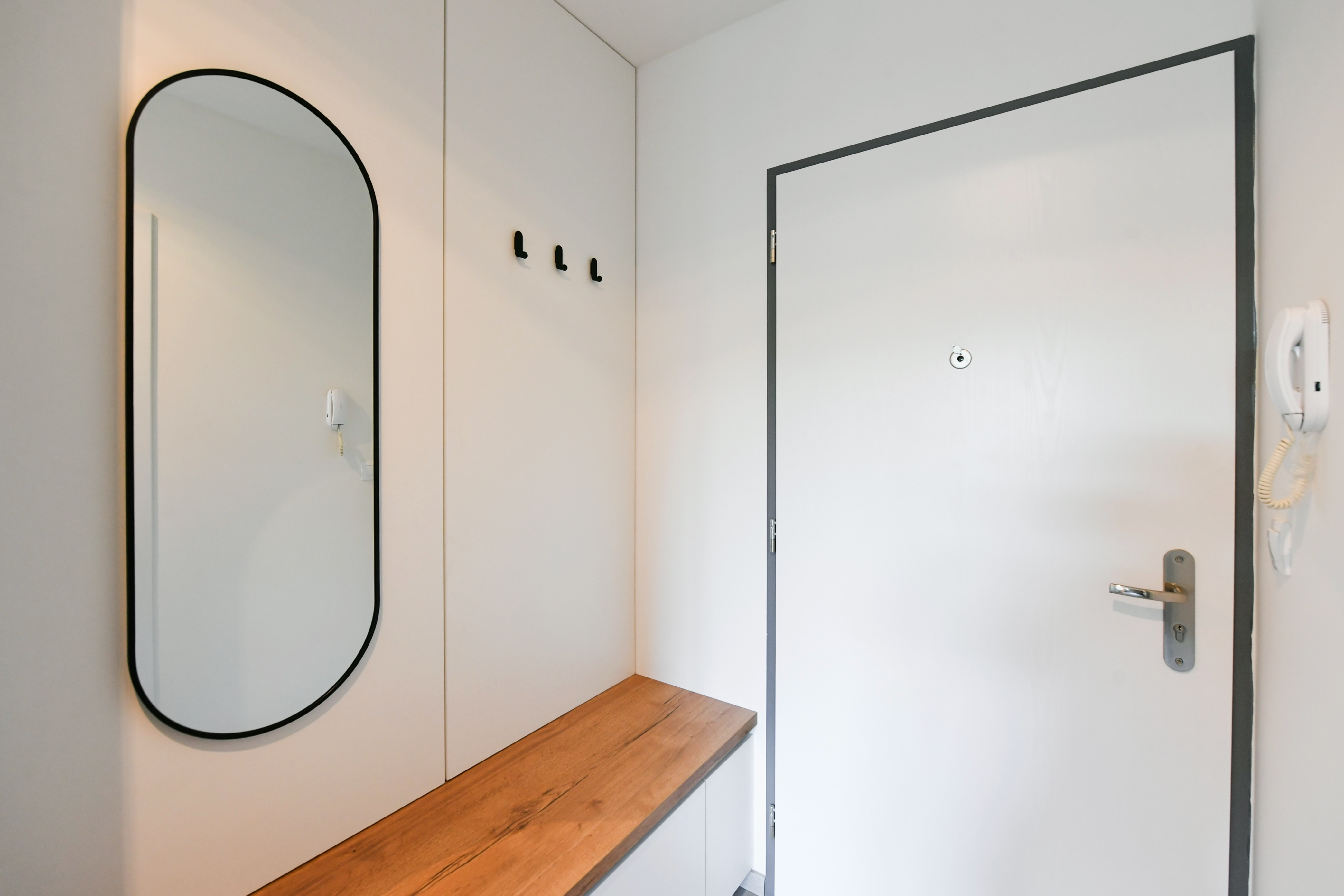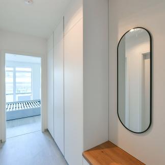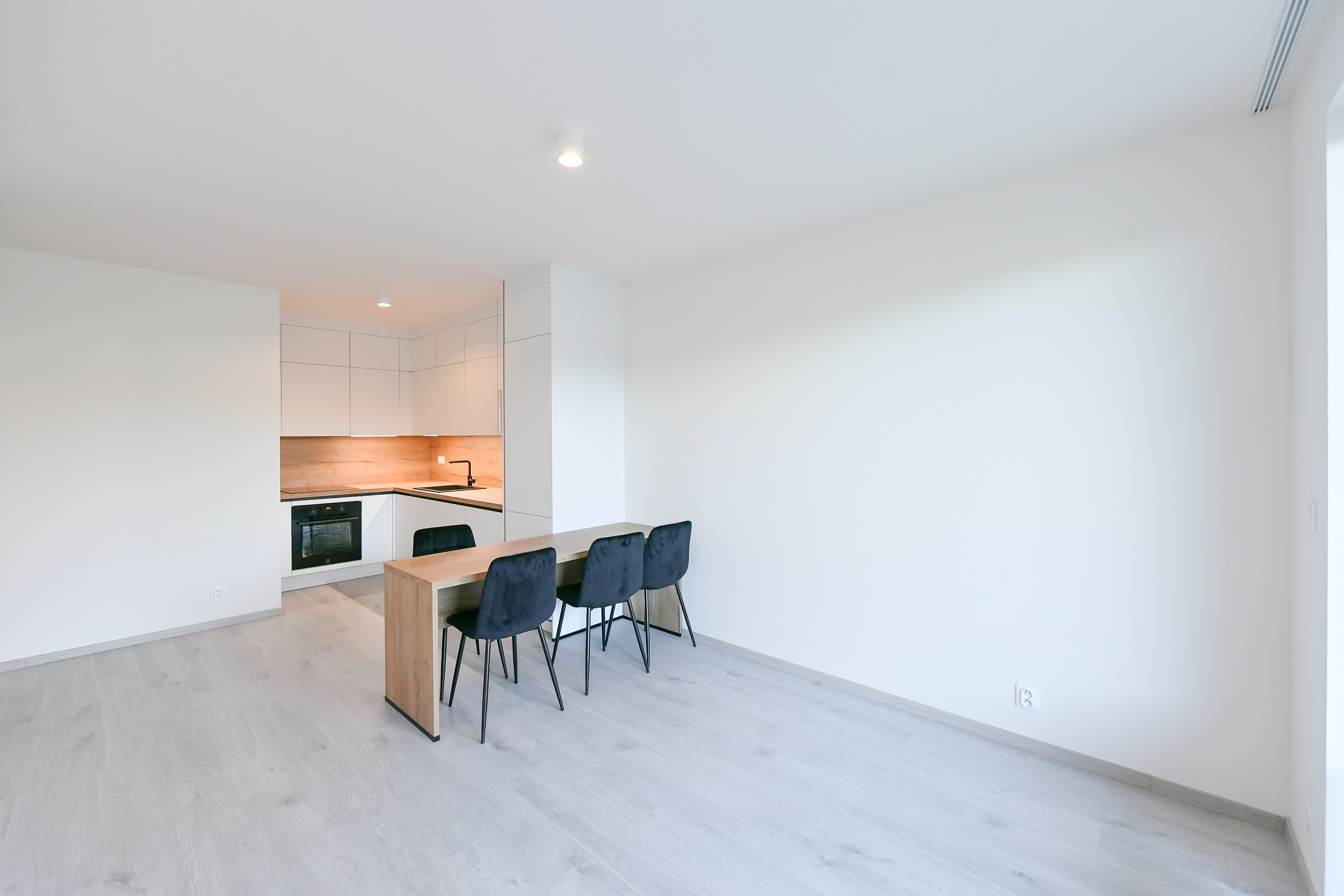Byt je velmi tichý, světlý a elegantní, vybaven kuchyňskou linkou s jídelním stolem a šatními skříněmi na míru v prostorné vstupní hale. V bytě se dále nachází koupelna se sprchovým koutem a místem pro pračku.