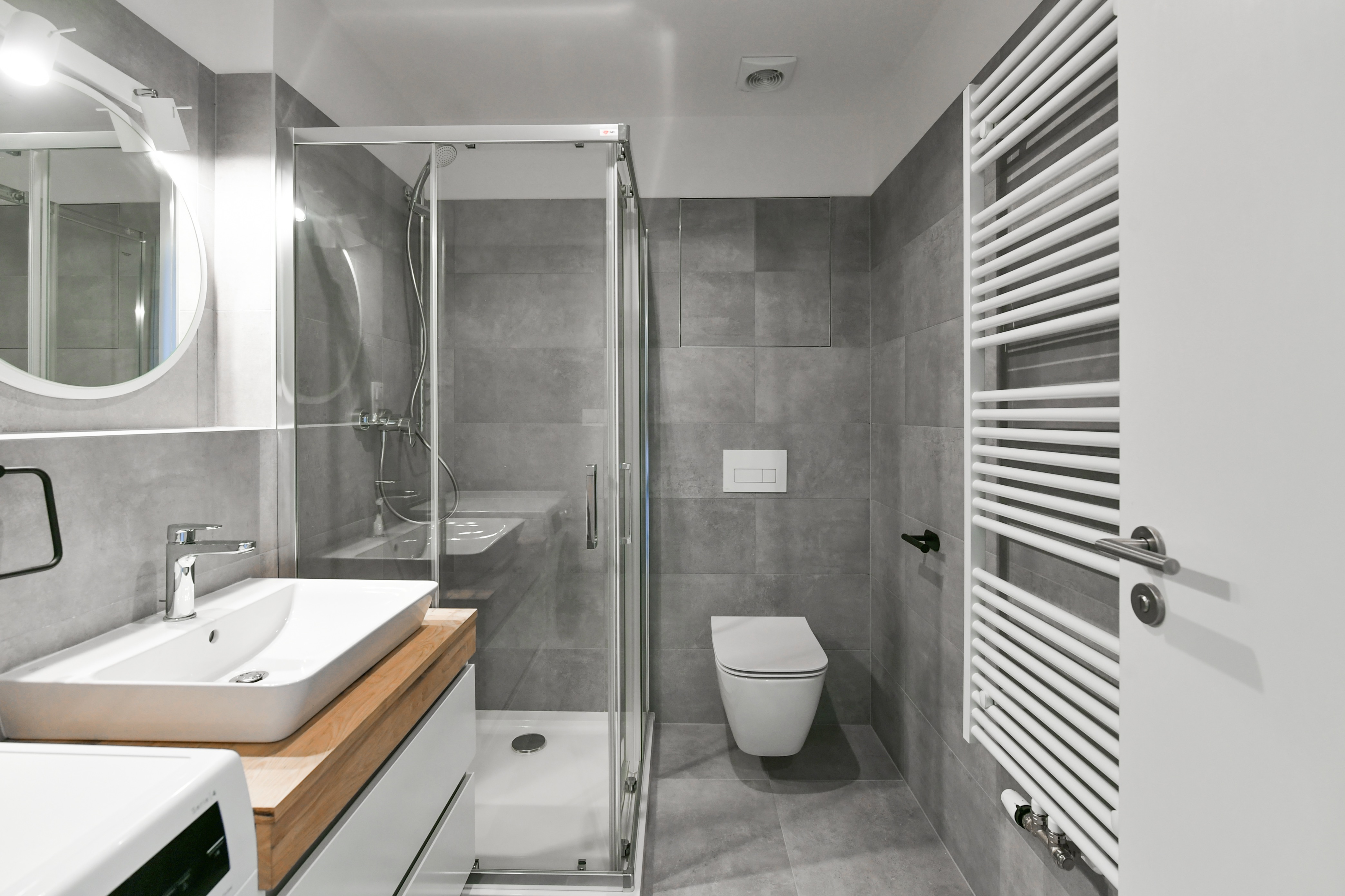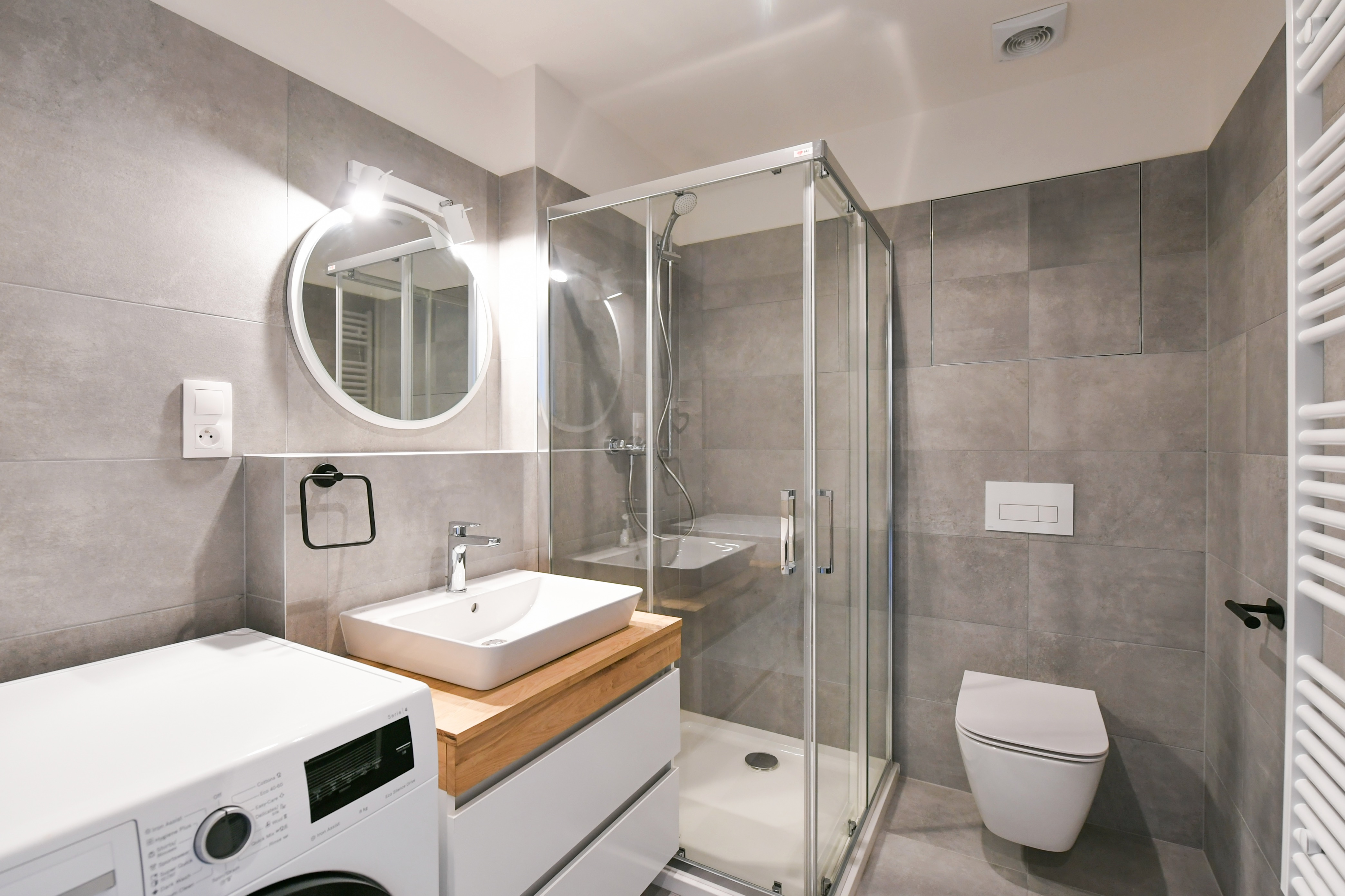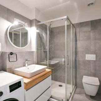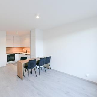 Byt je velmi tichý, světlý a elegantní, vybaven kuchyňskou linkou s jídelním stolem a šatními skříněmi na míru v prostorné vstupní hale. V bytě se dále nachází koupelna se sprchovým koutem a místem pro pračku.