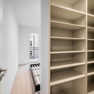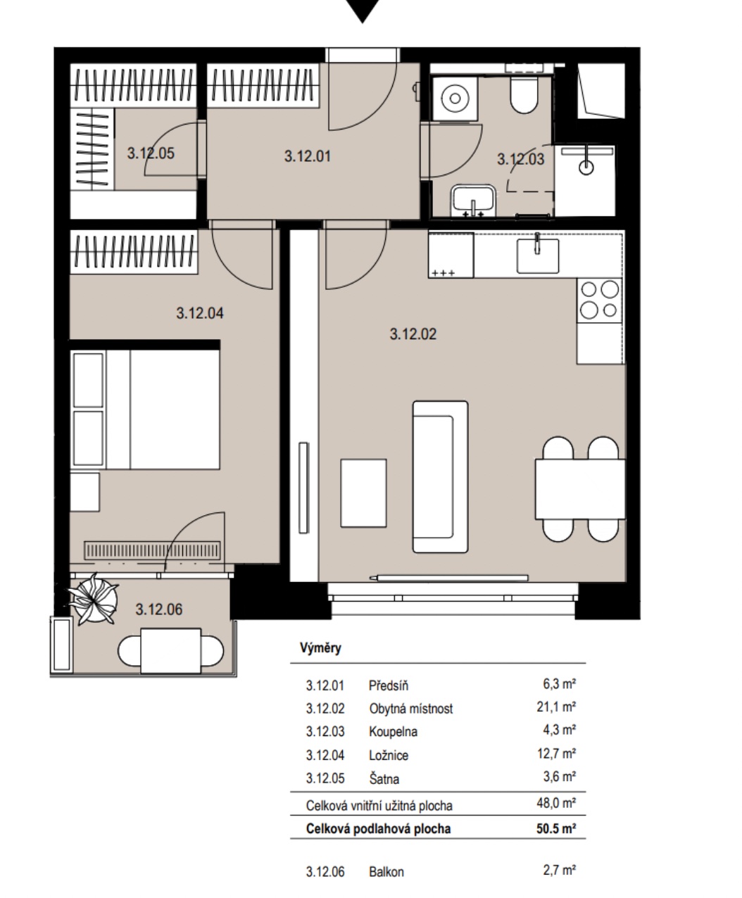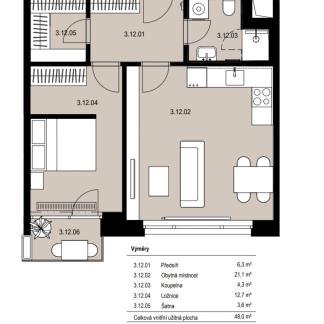 Byt má klasickou dispozici 2KK, z prostorné vstupní haly bytu jsou přímé vstupy do všech místností - obývacího pokoje, ložnice, koupelny a šatny/komory. Z ložnice je vstup na balkón o rozloze 2,7 m2. Vnitřní užitná plocha bytu je 48 m2. Byt je orientován do vedlejší ulice V Háji. K bytu dále náleží parkovací stání a sklepní kóje v podzemním podlaží projektu. Byt je vybaven trendy nábytkem na míru. Podlahy jsou vinylové, v koupelně je dlažba. Okna jsou bílá plastová. V domě je výtah.
