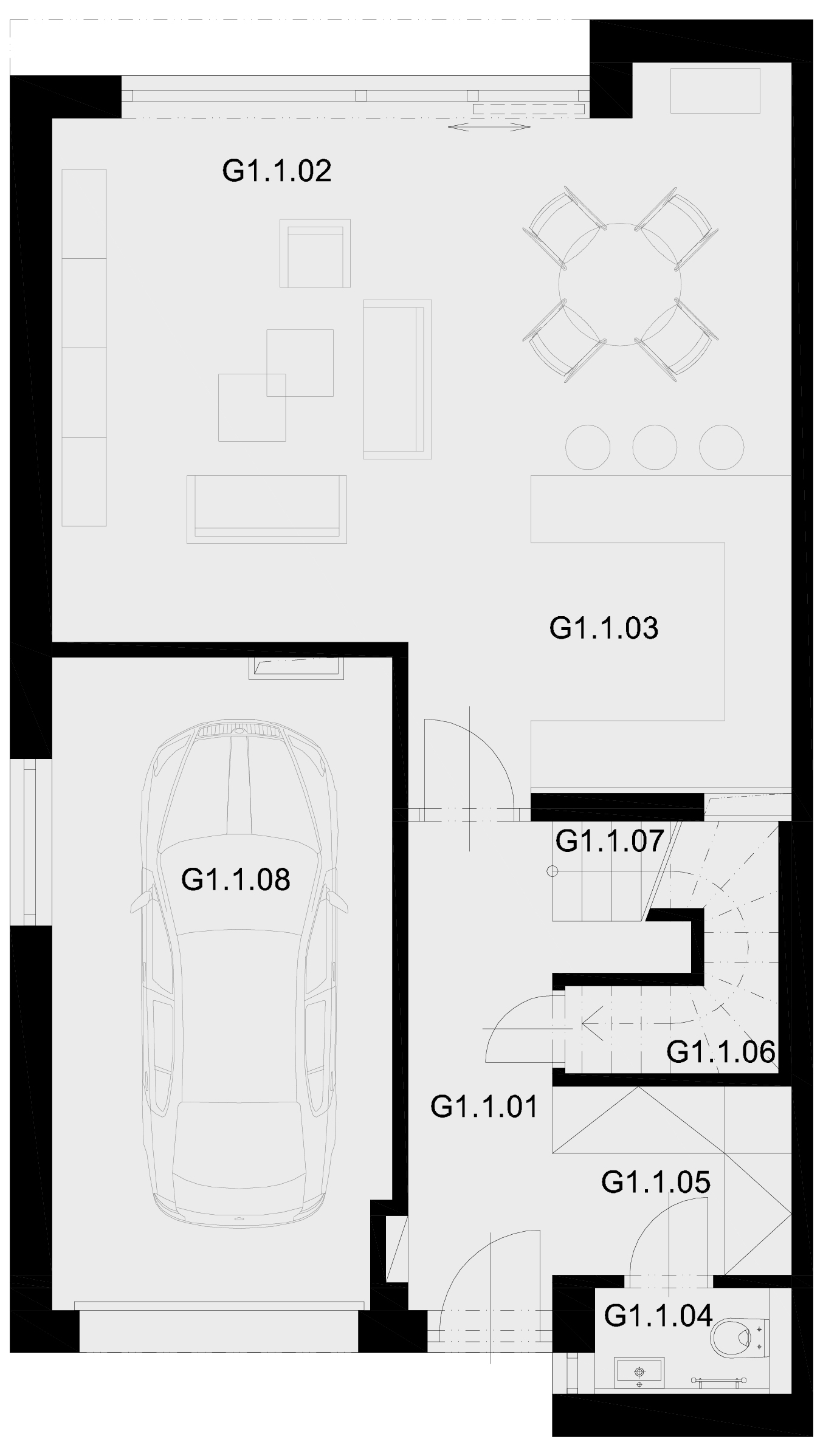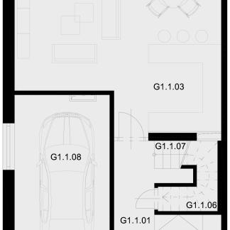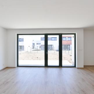 V přízemí domu se nachází prostorný obývací pokoj propojený s kuchyňským koutem (dohromady přes 36 m²) s výstupem na terasu a zahradu, vstupní chodba, šatna, samostatná toaleta, komora a vnitřní schodiště. Součástí přízemí je také garáž o velikosti 17,9 m², která umožňuje pohodlný vstup přímo do domu.