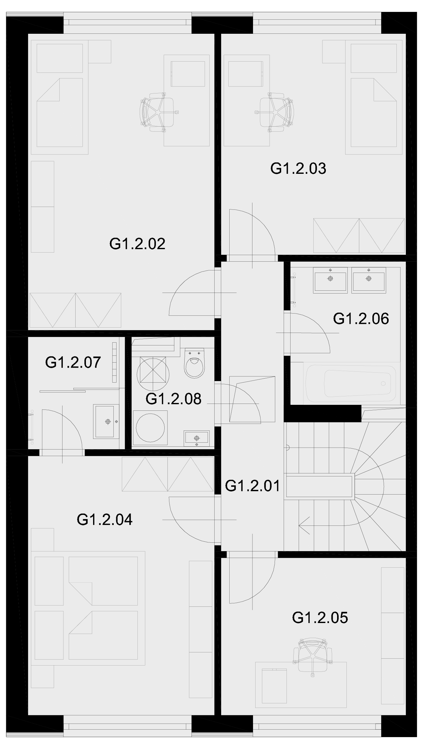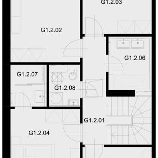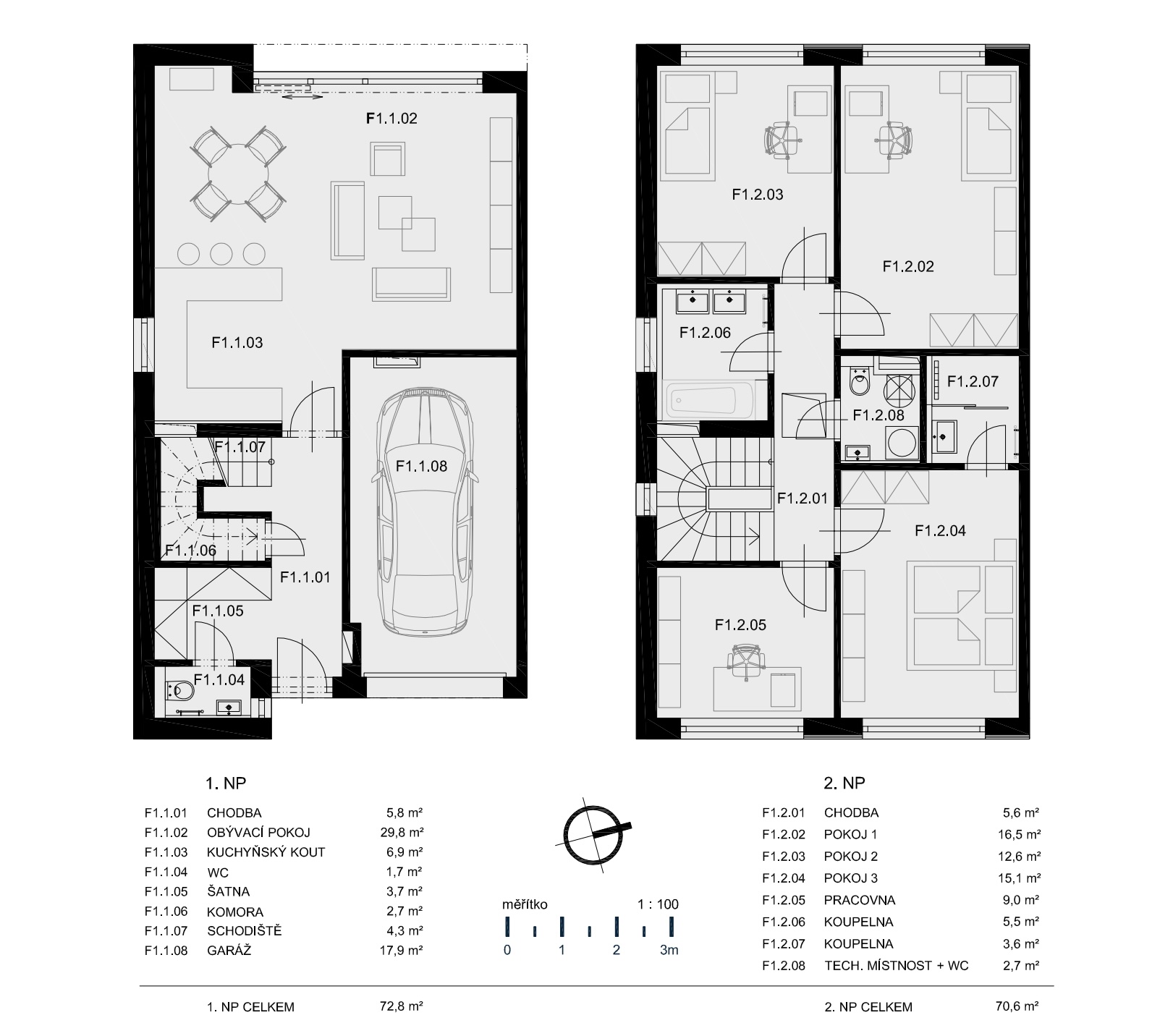 V patře naleznete tři samostatné ložnice – ložnice 1 (16,5 m²), ložnice 2 (12,6 m²), ložnice 3 (15,1 m²) – dále pracovnu (9,0 m²), dvě koupelny (jedna s vanou, druhá se sprchou) a technickou místnost s toaletou. Celková dispozice domu tak nabízí komfortní zázemí pro vícečlennou rodinu i možnost oddělené pracovny nebo pokoje pro hosty.
