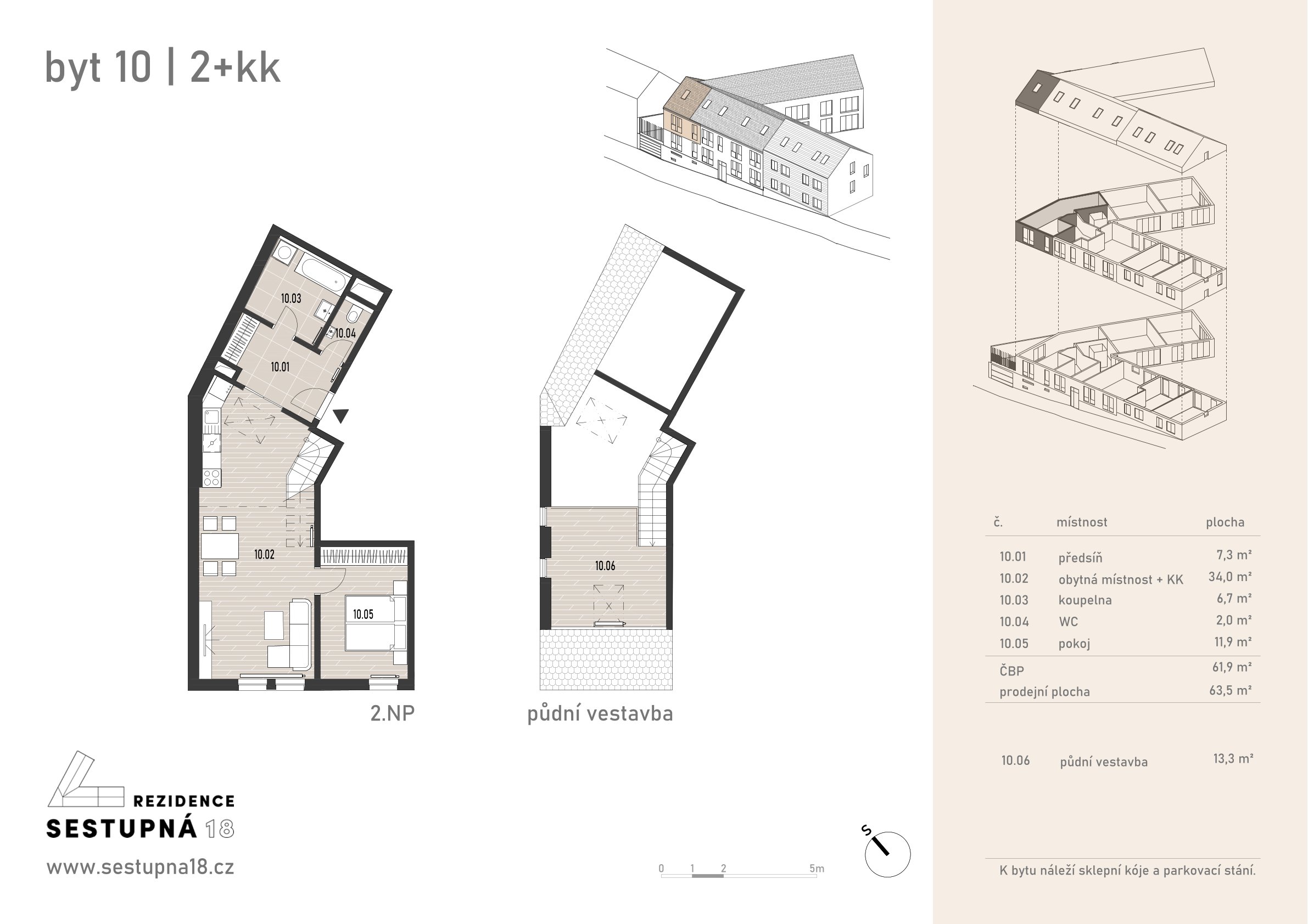 Byt č.10 je útulný atypický byt s potenciálem na 3kk. Je rozložen do dvou podlaží, kde vestavěná půdní galerie není započítána v užitné ploše, nicméně může sloužit jako další pokoj či pracovna. Prostor kuchyně, kam nezasahuje galerie, má přiznaný vysoký strop s trámy, což dodává bytu na zajímavosti a vzdušnosti. Do bytu je vstup z 2.nadzemního podlaží, kam se z garáží či od hlavního vchodu dostanete pohodlně výtahem. Byt je okny orientován na západ do klidné ulice Sestupná. Tento byt se nachází v části domu, která má díky svažitému terénu již výrazně vyvýšené přízemí a díky tomu je pocitově tento byt vnímán jako o patro výše.