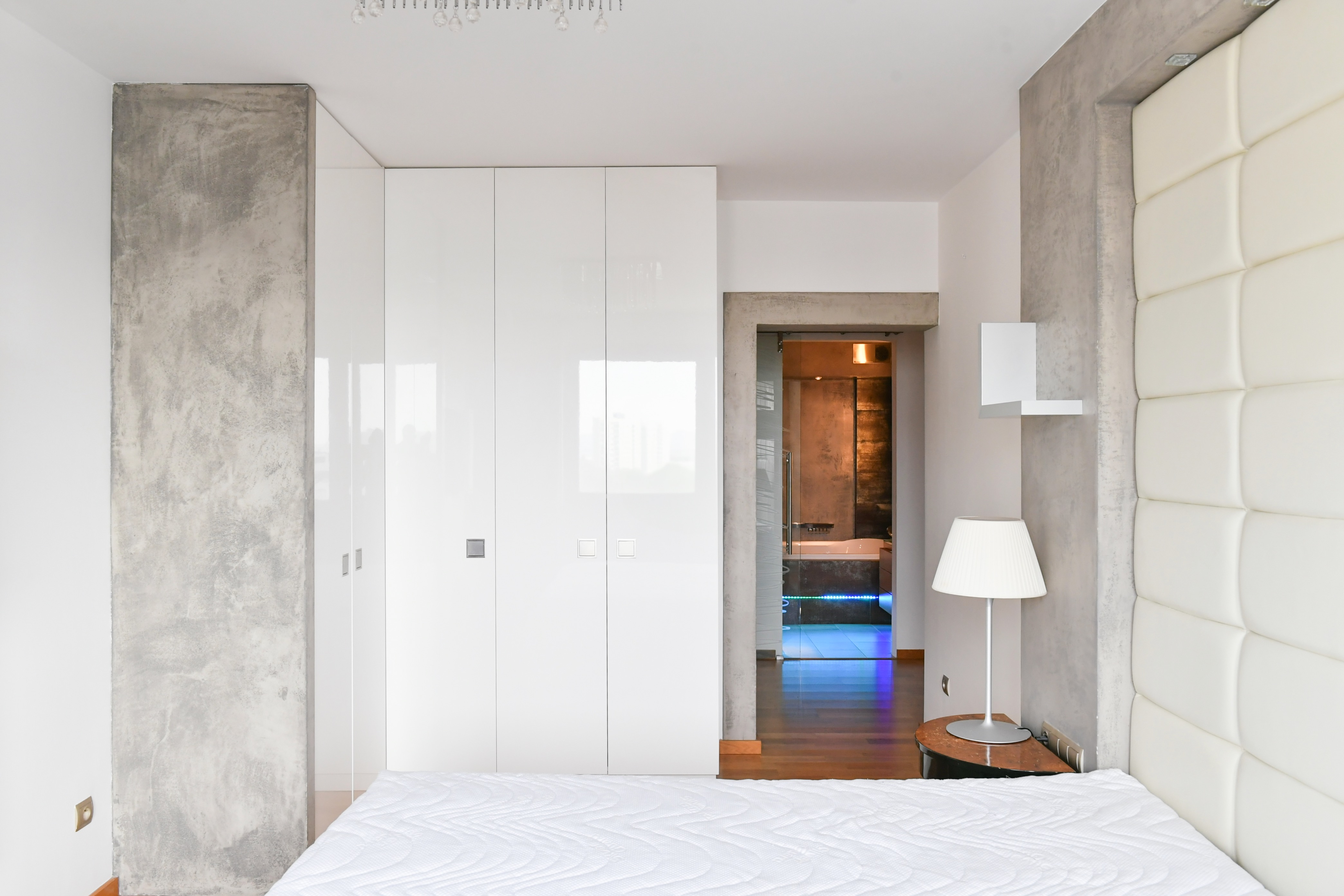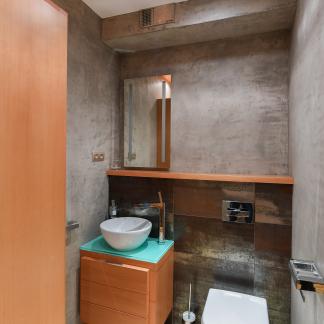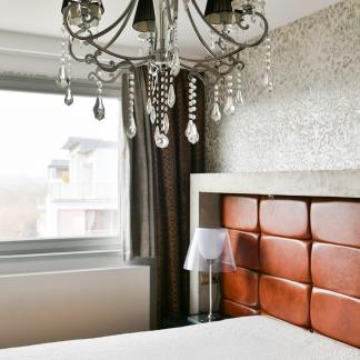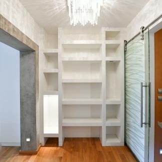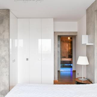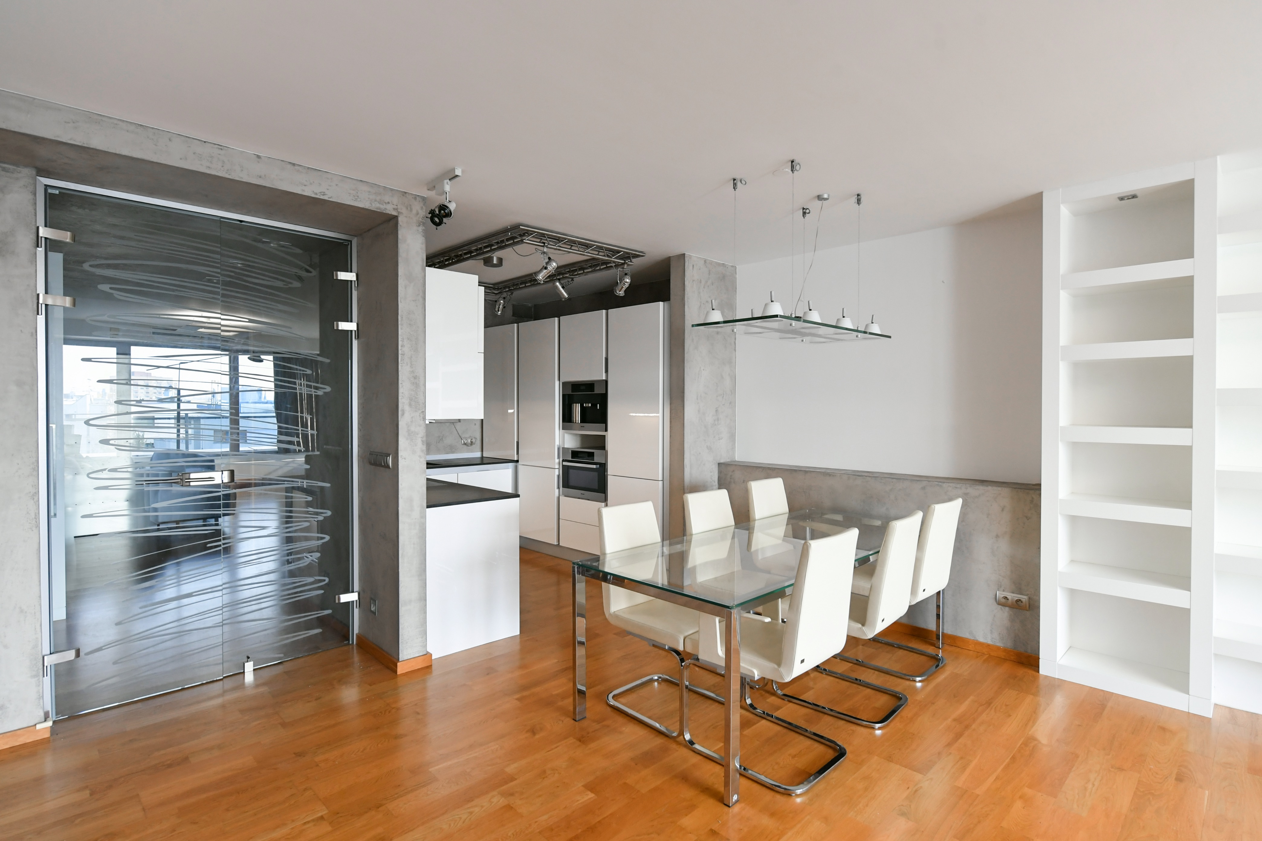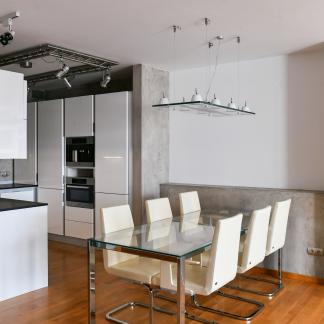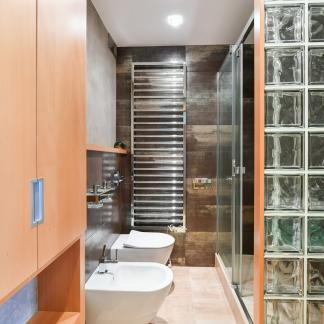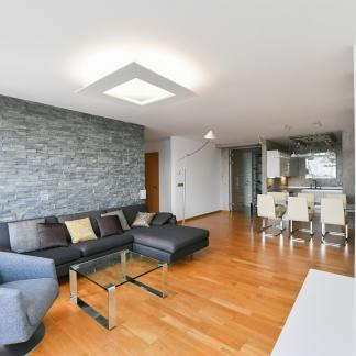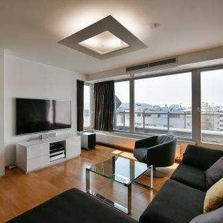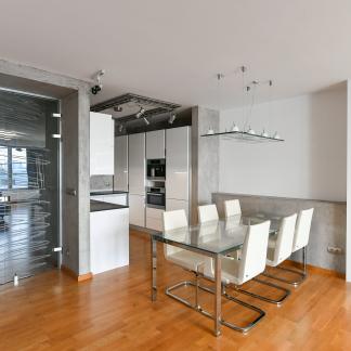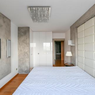 Popis dispozice: Z prostorné vchodové haly bytu je přímý vstup na toaletu pro návštěvy (kde je také umístěna pračka a sušička) a do komory - nyní zařízené nábytkem jako šatna. Přes prosklené a velice nadčasové dvoukřídlé dveře se vstupuje do hlavní obývací zóny s kuchyňským koutem a s přímým vstupem na prostorný balkón. Z obývací části se pak dále vstupuje přes foyer do soukromé části, kde se nachází 2 ložnice, 2 koupelny a šatna.
