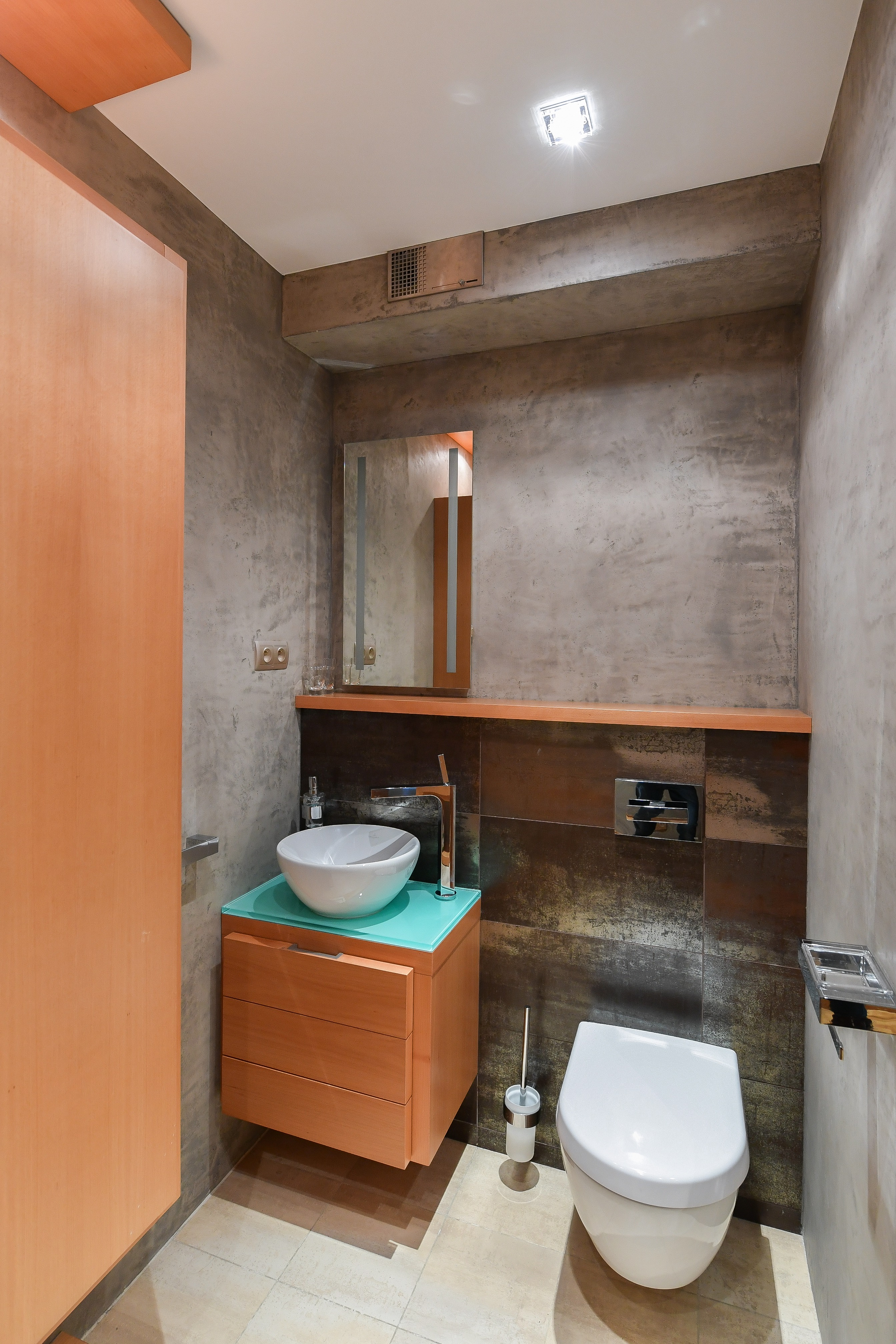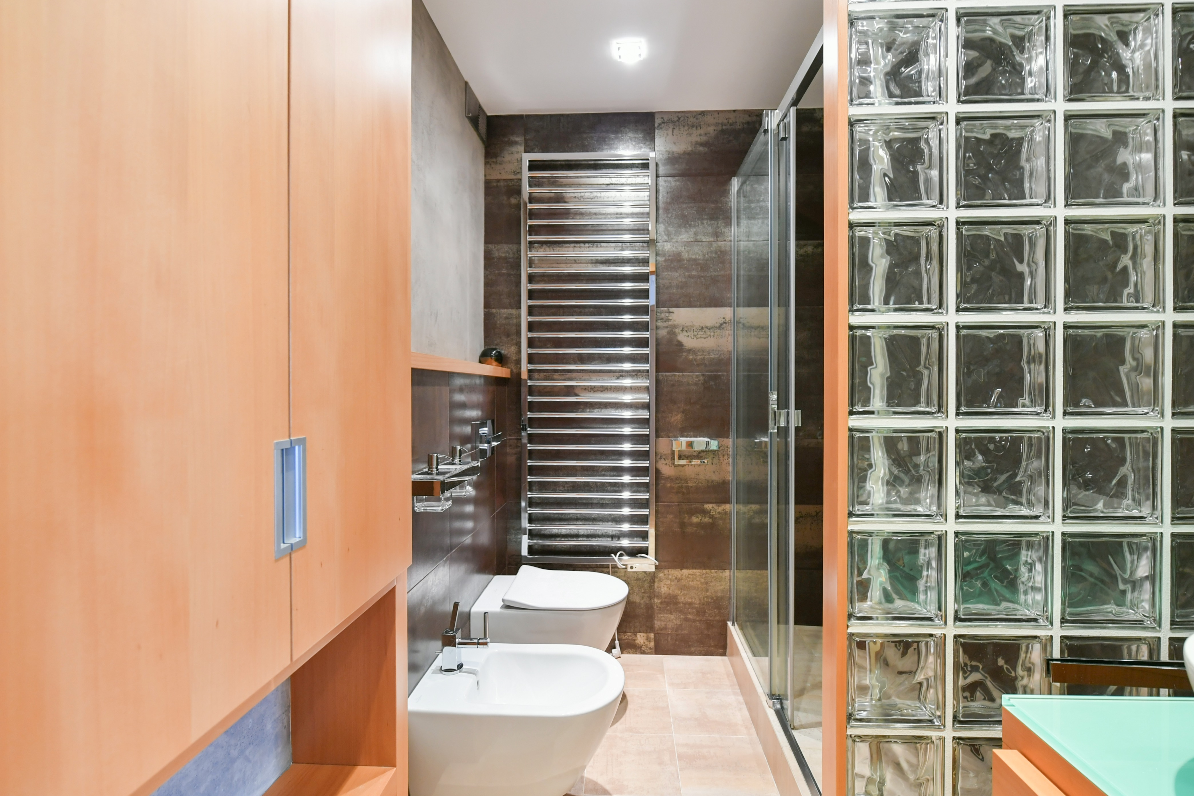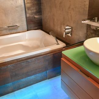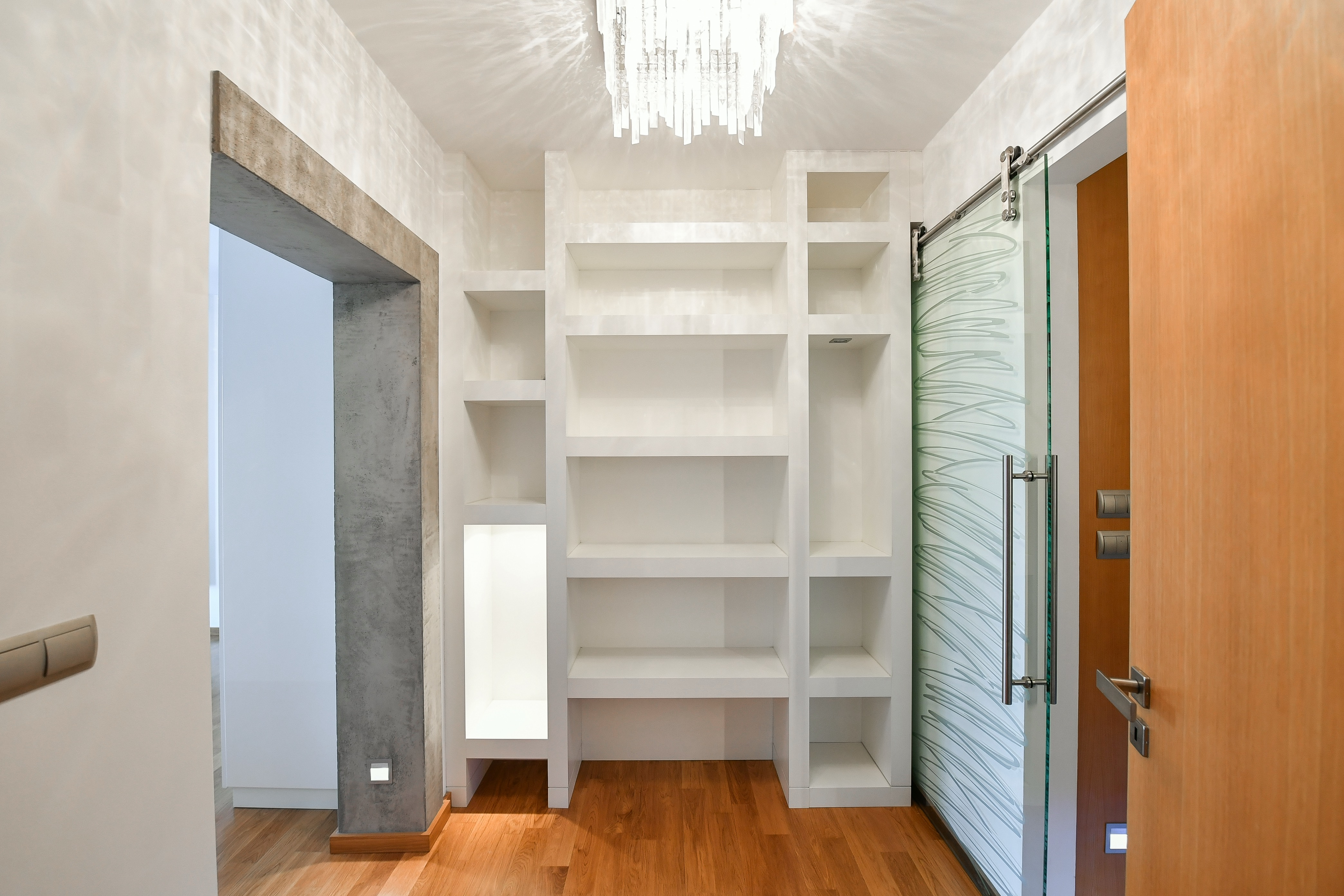 Popis dispozice: Z prostorné vchodové haly bytu je přímý vstup na toaletu pro návštěvy (kde je také umístěna pračka a sušička) a do komory - nyní zařízené nábytkem jako šatna. Přes prosklené a velice nadčasové dvoukřídlé dveře se vstupuje do hlavní obývací zóny s kuchyňským koutem a s přímým vstupem na prostorný balkón. Z obývací části se pak dále vstupuje přes foyer do soukromé části, kde se nachází 2 ložnice, 2 koupelny a šatna.