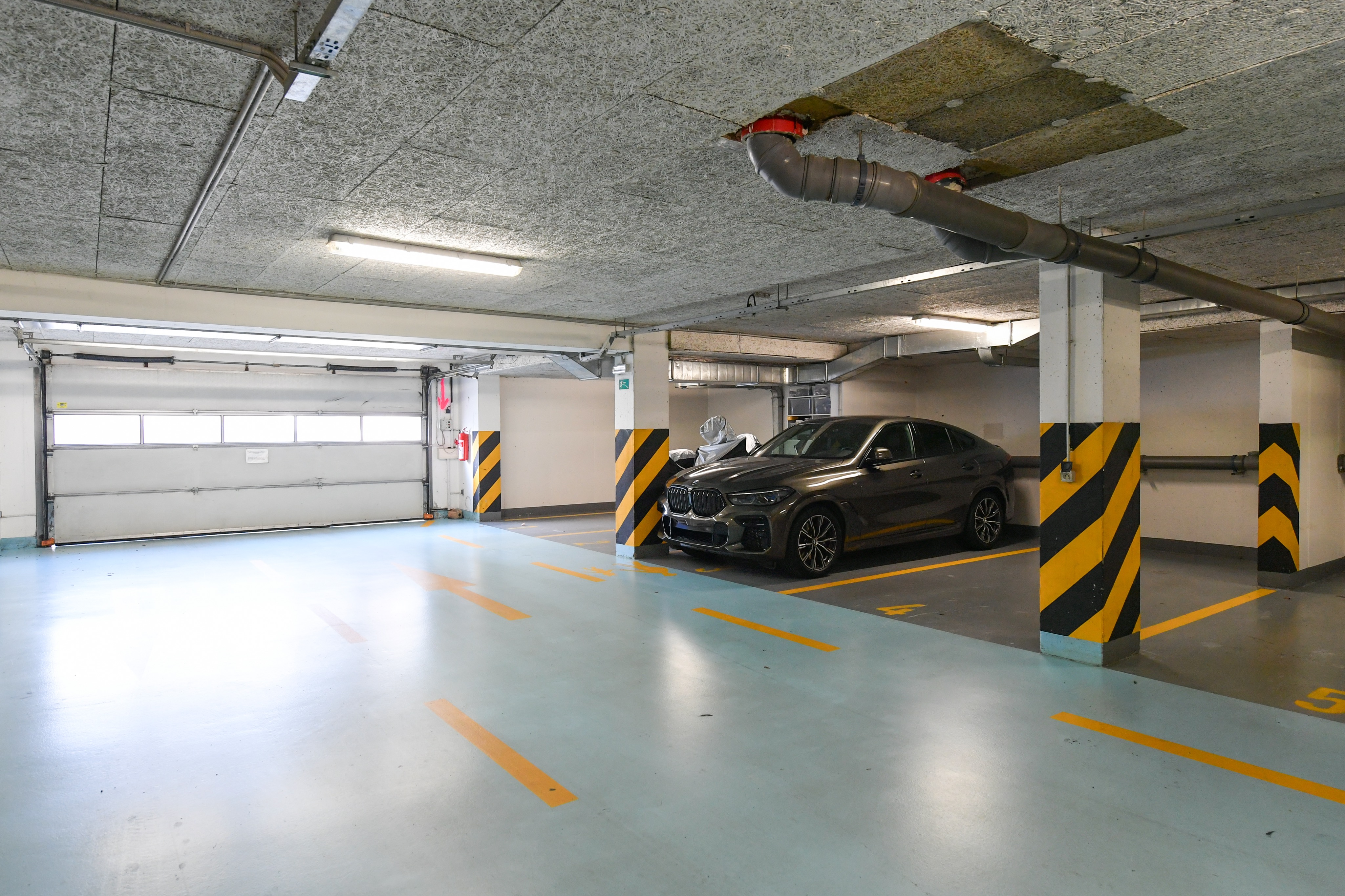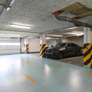 K bytu náleží jedno parkovací stání v podzemních garážích a prostorný sklep.