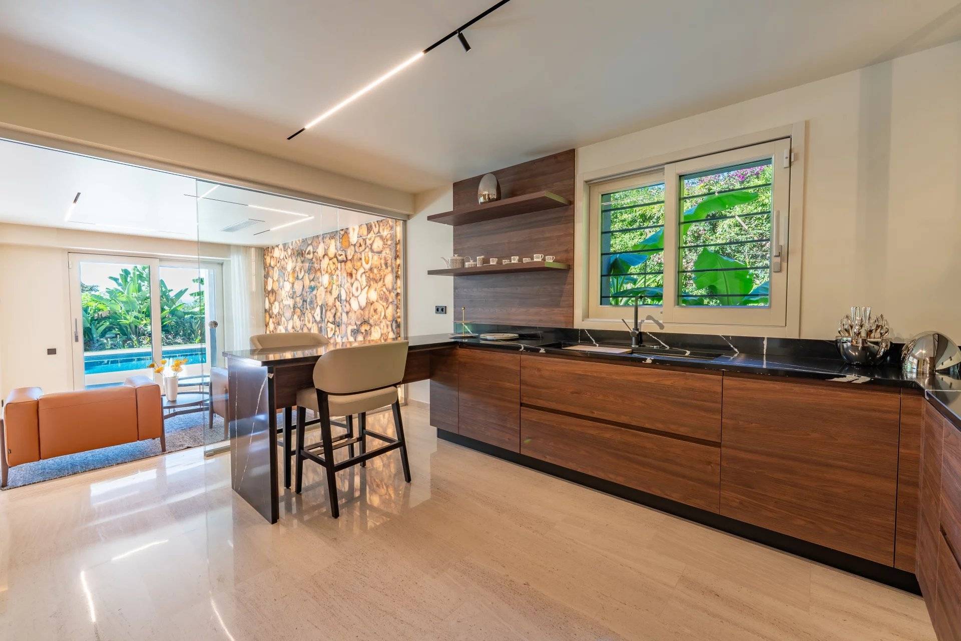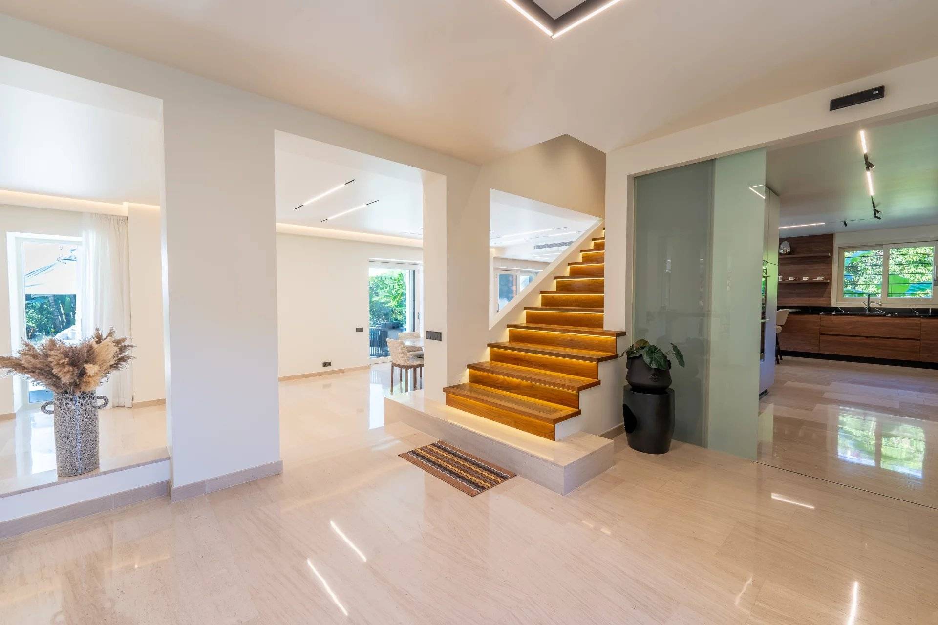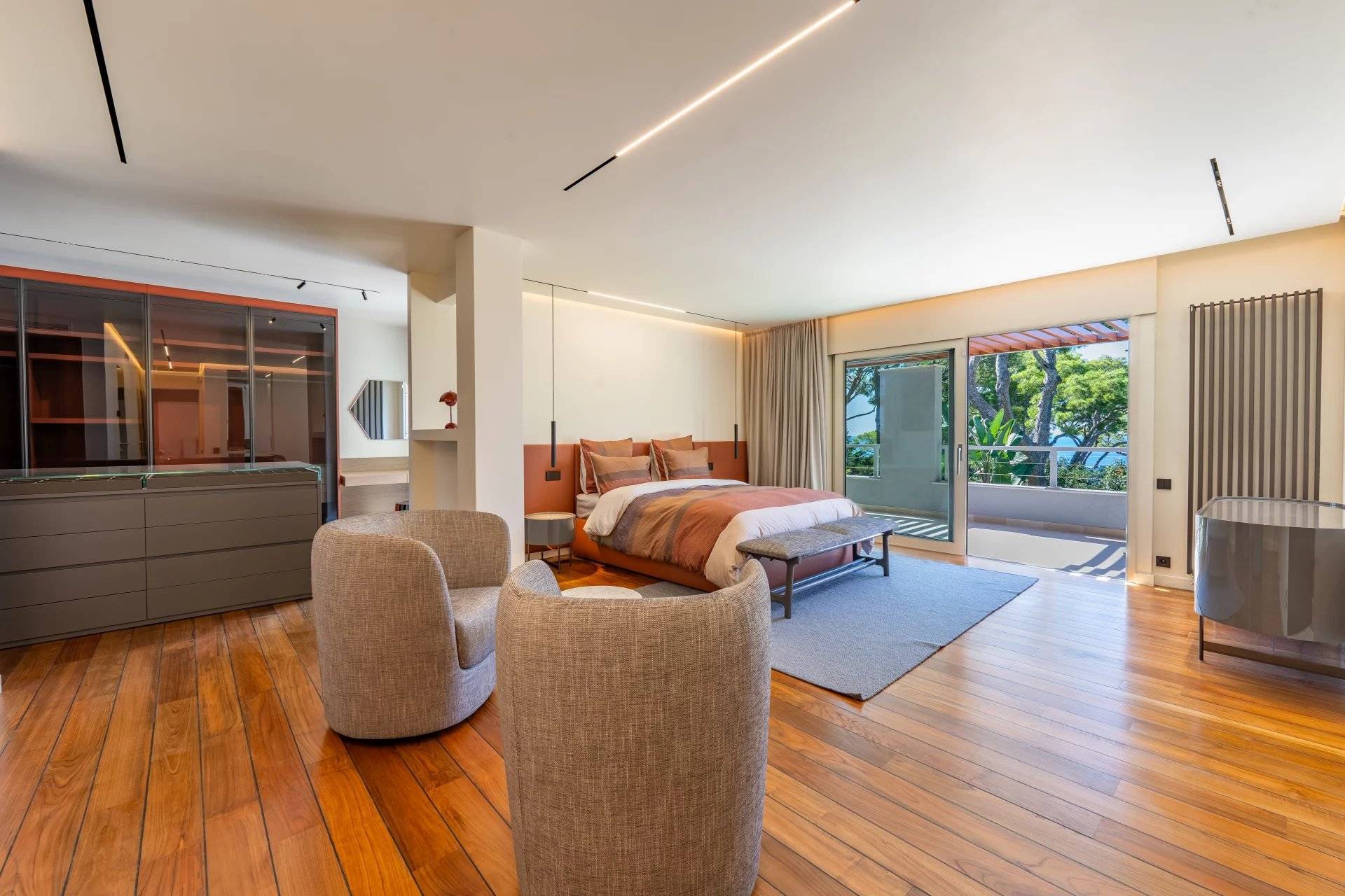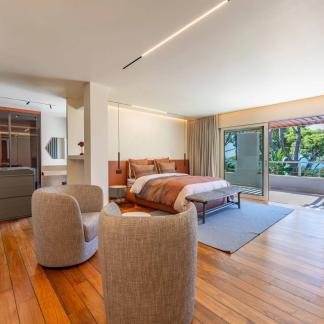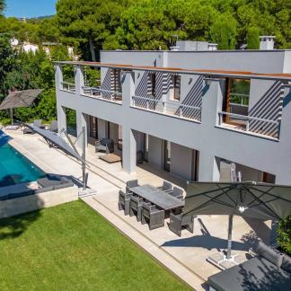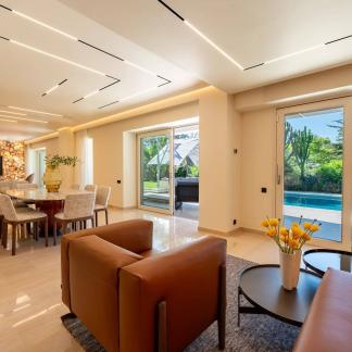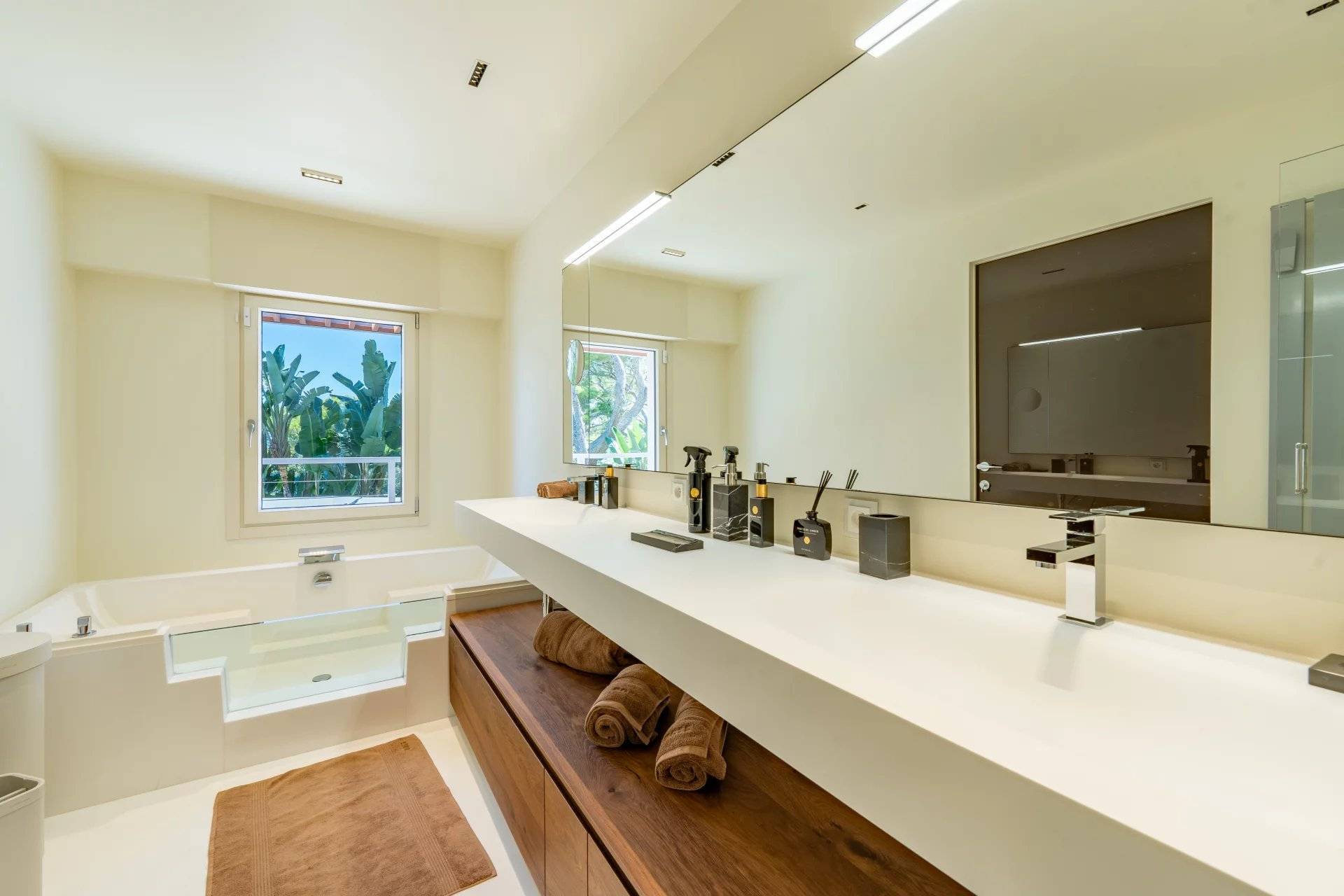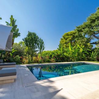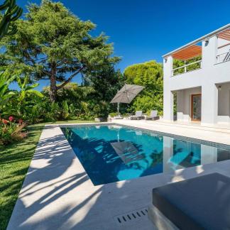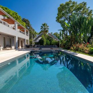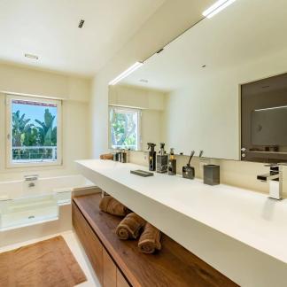 Okouzlující nemovitost v absolutním klidu, jen kousek od moře a Grand Hotelu. Tato jižně orientovaná vila o rozloze přes 400 m² byla kompletně zrekonstruována a vybavena luxusními prvky. Na úrovni zahrady, s výhledem na bazén, se nachází velký obývací pokoj a jídelna s krbem, odkud je přístup do kuchyně. Sprchový kout a toaleta pro hosty. Hlavní ložnice s koupelnou a sprchovým koutem, samostatnou toaletou a šatnou s výhledem do zahrady.