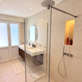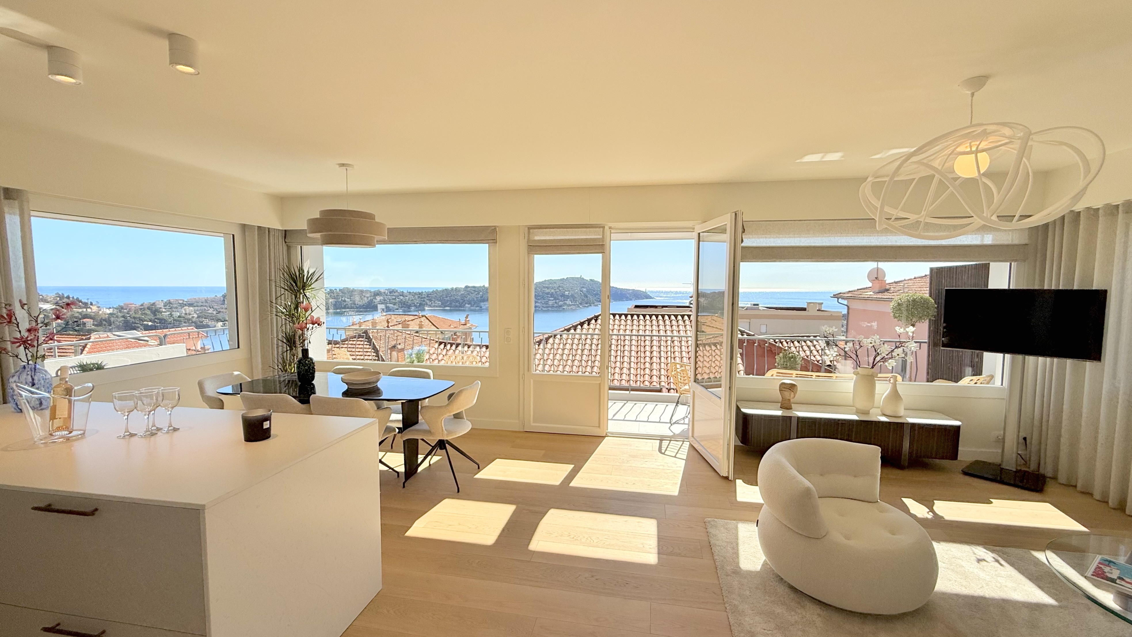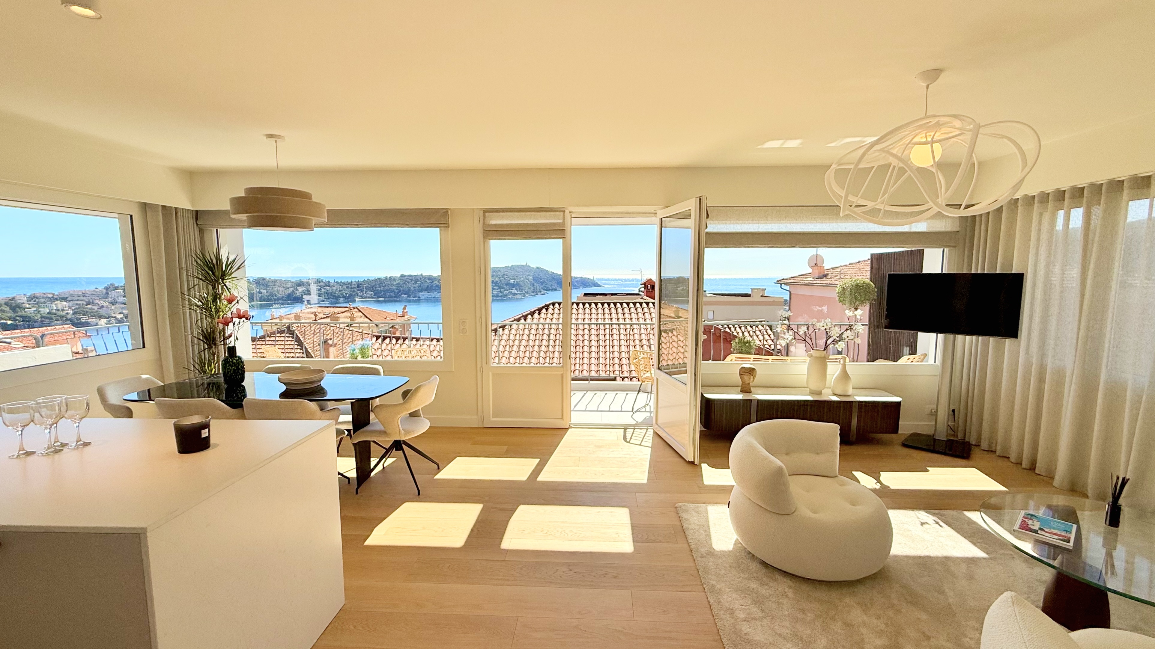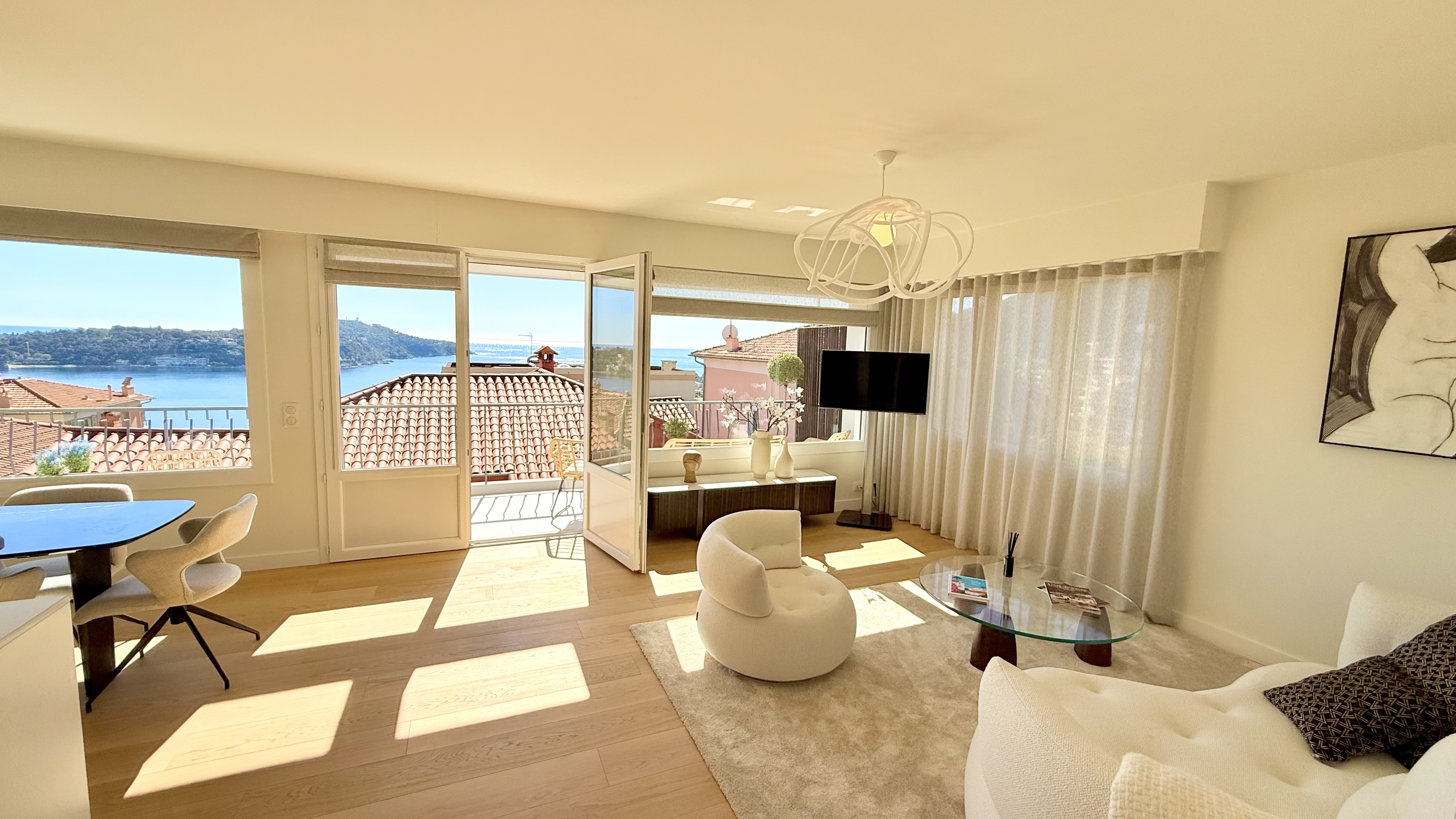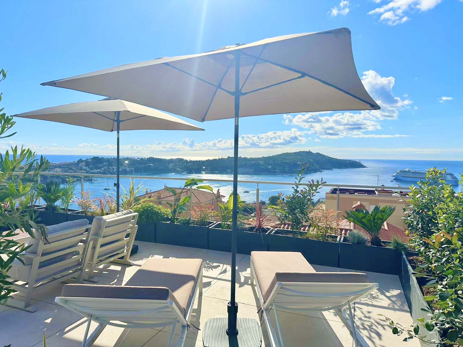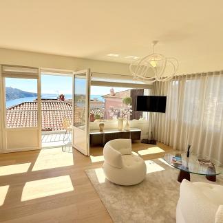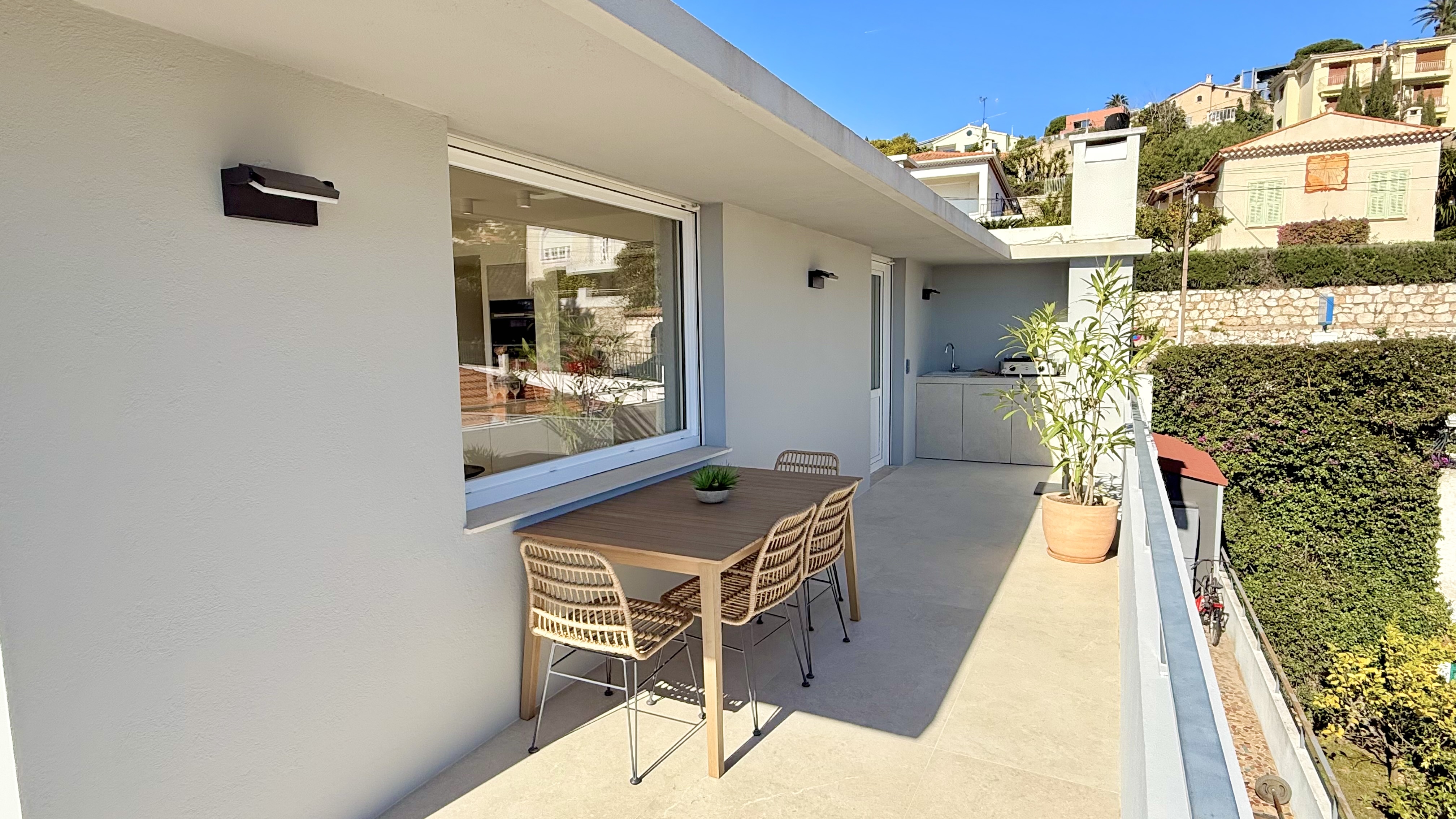 Výjimečný byt o rozloze přibližně 100 m² po renovaci, který se nachází v malém bytovém domě. Byt má samostatný vchod a skládá se z obývacího pokoje s otevřenou vybavenou kuchyní, která vede na slunnou terasu o rozloze přibližně 35 m² s letní kuchyní, dvou ložnic s vlastní koupelnou a třetí ložnice. Služby a renovace jsou na vysoké úrovni. Klidná lokalita v blízkosti občanské vybavenosti, s krásným výhledem na moře, přístav Villefranche a Cap Ferrat. Snadné parkování. Střešní terasa o rozloze 100 m².